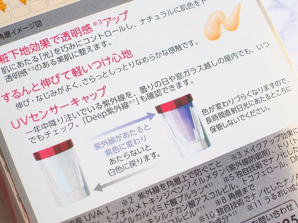 - トーンアップ*1するクリア肌を実現するUV下地です。 表情変化等でたくさん動く肌でも、伸縮性のあるD-UVガード+*2膜が肌にぴったりフィット。 「いつのまにか日焼け」を防ぎ、透明美白肌*1に整えます。 *1 メイクアップ効果による。 *2酸化チタン、t-ブチルメトキシジベンゾイルメタン(紫外線防御剤)、トリ(トリメチルシロキシ)シリルプロピルカルバミド酸プルラン(うるおい成分)。