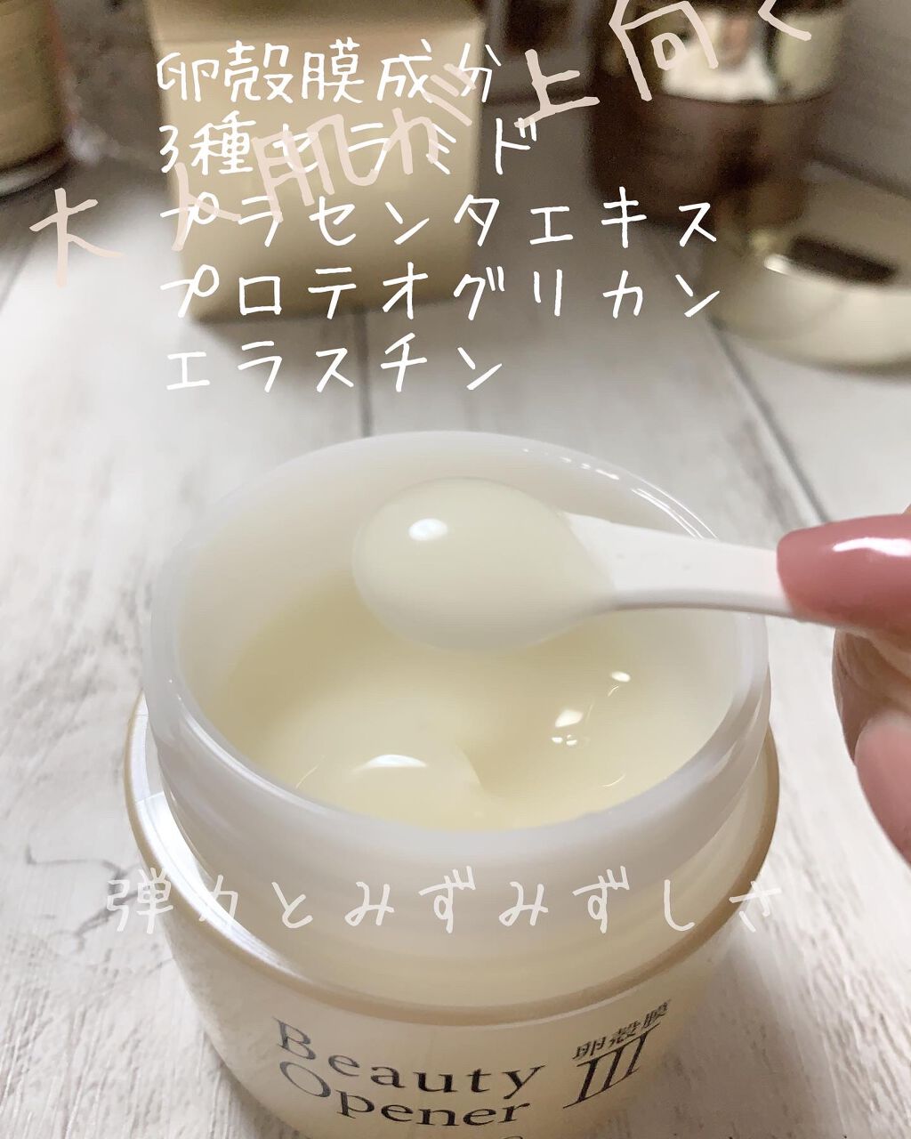 実際❕集中ケアとして厚塗りして眠るをしてみたらちゃんとぷるぷるむきたてたまご肌🥚が現れます♪ 追い美容ジェルとして 足りない部分や気になる部分に塗り足すとさらに良い効果が期待できます🌷 オールインワンなのですが!私は乾燥肌なので お化粧水で充分うるおいを保水してから塗ります♪ ぷるぷる さっぱりと使える1つで化粧水 美容液 保湿ジェル 乳液 化粧下地 うるおいパック効果の6役の卵殻膜オールインワンジェル ビューティーオープナージェルは 卵殻膜成分(加水分解卵殻膜)を配合しているため ハリ 弾力のあるみずみずしさを与えます コラーゲン ヒアルロン酸 プロテオグリカン セラミド プラセンタエキス スクワランの美容成分を配合 すばやく成分が届き 肌のキメが細やかなうるおいあふれる肌へ導きます