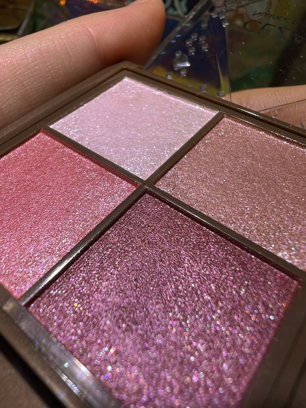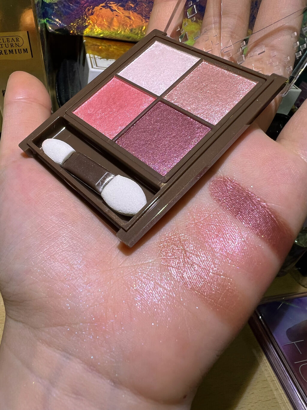 excel リアルクローズシャドウ CS04 プラムニット 青みくすみピンク! 小粒ラメ 密着感すごい!肌本来の艶感みたい 良い❣️ 下の2色は特に良い! 右上:ベース 左下:メインカラー 右下:アイライナー 左上:涙袋