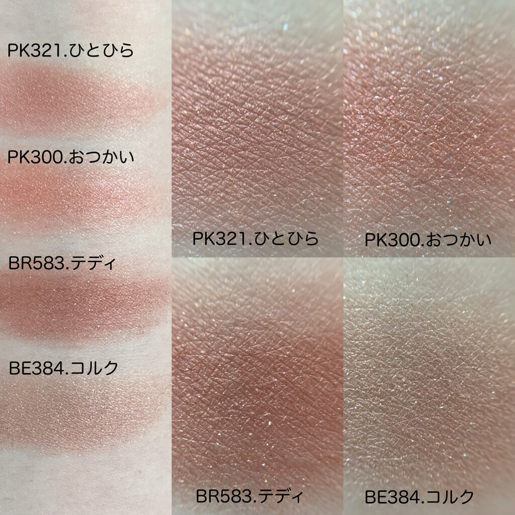 - <BE121 恋の達人> タルク、ワセリン、ジメチコン、セスキイソステアリン酸ソルビタン、ポリメタクリル酸メチル、ミネラルオイル、テトラヒドロテトラメチルシクロテトラシロキサン、テトラデセン、トコフェロール、エチルパラベン、(+/-)マイカ、酸化チタン、酸化鉄、合成金雲母、赤226、黄401、青404 <BE203 綿菓子> タルク、リンゴ酸ジイソステアリル、焼成セリサイト、トリエチルヘキサノイン、ワセリン、セスキイソステアリン酸ソルビタン、酸化亜鉛、ミリスチン酸亜鉛、エチルヘキシルグリセリン、ハイドロゲンジメチコン、酸化スズ、トリエトキシカプリリルシラン、トコフェロール、水酸化Al、テトラヒドロテトラメチルシクロテトラシロキサン、テトラデセン、クロルフェネシン、マイカ、合成金雲母、酸化チタン、酸化鉄 <BE286 ゴージャス姉妹> タルク、リンゴ酸ジイソステアリル、トリオクタノイン、セスキイソステアリン酸ソルビタン、ミリスチン酸亜鉛、シリカ、トコフェロール、テトラヒドロテトラメチルシクロテトラシロキサン、テトラデセン、エチルパラベン、マイカ、酸化チタン、酸化鉄、グンジョウ、酸化亜鉛、赤226 <BE330 マサラチャイ> タルク、リンゴ酸ジイソステアリル、メタクリル酸メチルクロスポリマー、トリエチルヘキサノイン、ワセリン、ミリスチン酸亜鉛、酸化亜鉛、セスキイソステアリン酸ソルビタン、エチルヘキシルグリセリン、アルミナ、酸化スズ、トコフェロール、テトラヒドロテトラメチルシクロテトラシロキサン、テトラデセン、クロルフェネシン、マイカ、酸化チタン、酸化鉄、合成金雲母、グンジョウ、赤226 <BE384 コルク> タルク、ワセリン、トリエチルヘキサノイン、ジメチコン、酸化亜鉛、セスキイソステアリン酸ソルビタン、メタクリル酸メチルクロスポリマー、ミリスチン酸亜鉛、エチルヘキシルグリセリン、酸化スズ、トリエトキシカプリリルシラン、トコフェロール、クロルフェネシン、マイカ、酸化鉄、酸化チタン、合成金雲母、グンジョウ <BK922 黒蜥蜴> タルク、リンゴ酸ジイソステアリル、トリエチルヘキサノイン、ワセリン、酸化亜鉛、セスキイソステアリン酸ソルビタン、ミリスチン酸亜鉛、エチルヘキシルグリセリン、テトラヒドロテトラメチルシクロテトラシロキサン、テトラデセン、トコフェロール、クロルフェネシン、マイカ、酸化鉄、合成金雲母、酸化チタン、コンジョウ、グンジョウ <BR331 シナモン> タルク、リンゴ酸ジイソステアリル、メタクリル酸メチルクロスポリマー、トリエチルヘキサノイン、ワセリン、セスキイソステアリン酸ソルビタン、酸化亜鉛、ミリスチン酸亜鉛、エチルヘキシルグリセリン、酸化スズ、テトラヒドロテトラメチルシクロテトラシロキサン、トコフェロール、テトラデセン、クロルフェネシン、マイカ、酸化鉄、合成金雲母、酸化チタン <BR332 胡桃> タルク、リンゴ酸ジイソステアリル、メタクリル酸メチルクロスポリマー、トリエチルヘキサノイン、ワセリン、酸化亜鉛、ミリスチン酸亜鉛、セスキイソステアリン酸ソルビタン、エチルヘキシルグリセリン、酸化スズ、トコフェロール、テトラヒドロテトラメチルシクロテトラシロキサン、テトラデセン、ヒドロキシプロピルセルロース、クロルフェネシン、マイカ、酸化チタン、酸化鉄、合成金雲母、コンジョウ <BR583 テディ> タルク、ワセリン、トリエチルヘキサノイン、シリカ、ジメチコン、酸化亜鉛、セスキイソステアリン酸ソルビタン、ミリスチン酸亜鉛、エチルヘキシルグリセリン、トリエトキシカプリリルシラン、酸化スズ、トコフェロール、クロルフェネシン、マイカ、酸化鉄、合成金雲母、グンジョウ、酸化チタン <BR703 コナ> タルク、リンゴ酸ジイソステアリル、焼成セリサイト、トリエチルヘキサノイン、ワセリン、ミリスチン酸亜鉛、酸化亜鉛、セスキイソステアリン酸ソルビタン、エチルヘキシルグリセリン、ハイドロゲンジメチコン、トリエトキシカプリリルシラン、酸化スズ、トコフェロール、クロルフェネシン、マイカ、合成金雲母、酸化鉄、酸化チタン、グンジョウ <GD822 ゴールデン> タルク、リンゴ酸ジイソステアリル、トリオクタノイン、セスキイソステアリン酸ソルビタン、トコフェロール、テトラヒドロテトラメチルシクロテトラシロキサン、テトラデセン、エチルパラベン、(+/-)マイカ、酸化鉄、酸化チタン、合成金雲母 <OR300 みちしるべ> タルク、リンゴ酸ジイソステアリル、メタクリル酸メチルクロスポリマー、トリエチルヘキサノイン、ワセリン、酸化亜鉛、ミリスチン酸亜鉛、セスキイソステアリン酸ソルビタン、エチルヘキシルグリセリン、ジメチコン、ハイドロゲンジメチコン、酸化スズ、トコフェロール、テトラヒドロテトラメチルシクロテトラシロキサン、ヒドロキシプロピルセルロース、テトラデセン、クロルフェネシン、マイカ、酸化チタン、酸化鉄、合成金雲母、黄4 <OR481 マリー> タルク、ワ