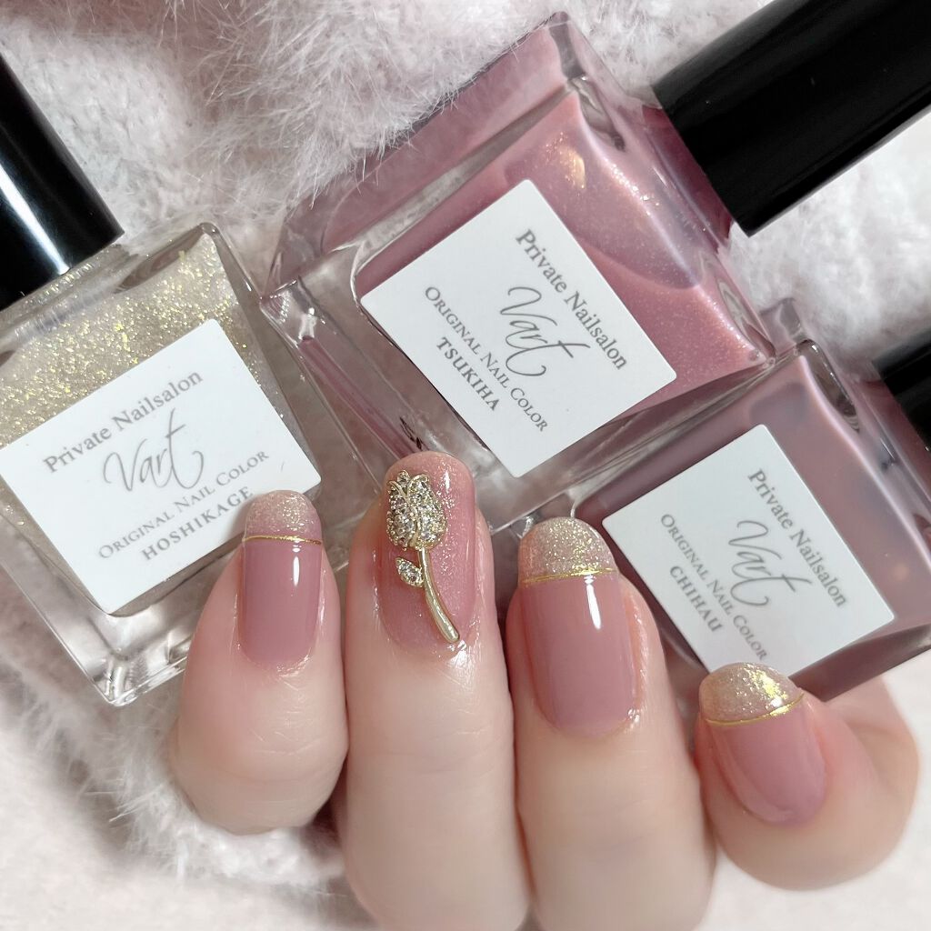 コゼットジョリの押し花ネイルです。人差し指と小指は桜そそを2度塗りで、若干の透け感あり。中指は三度塗りしましたら少しパープルよりなにりました。三度塗りすると、はぎたおやかの一度塗りと色の雰囲気が似てるかな?と思いました。親指と薬指はしゃくやく...