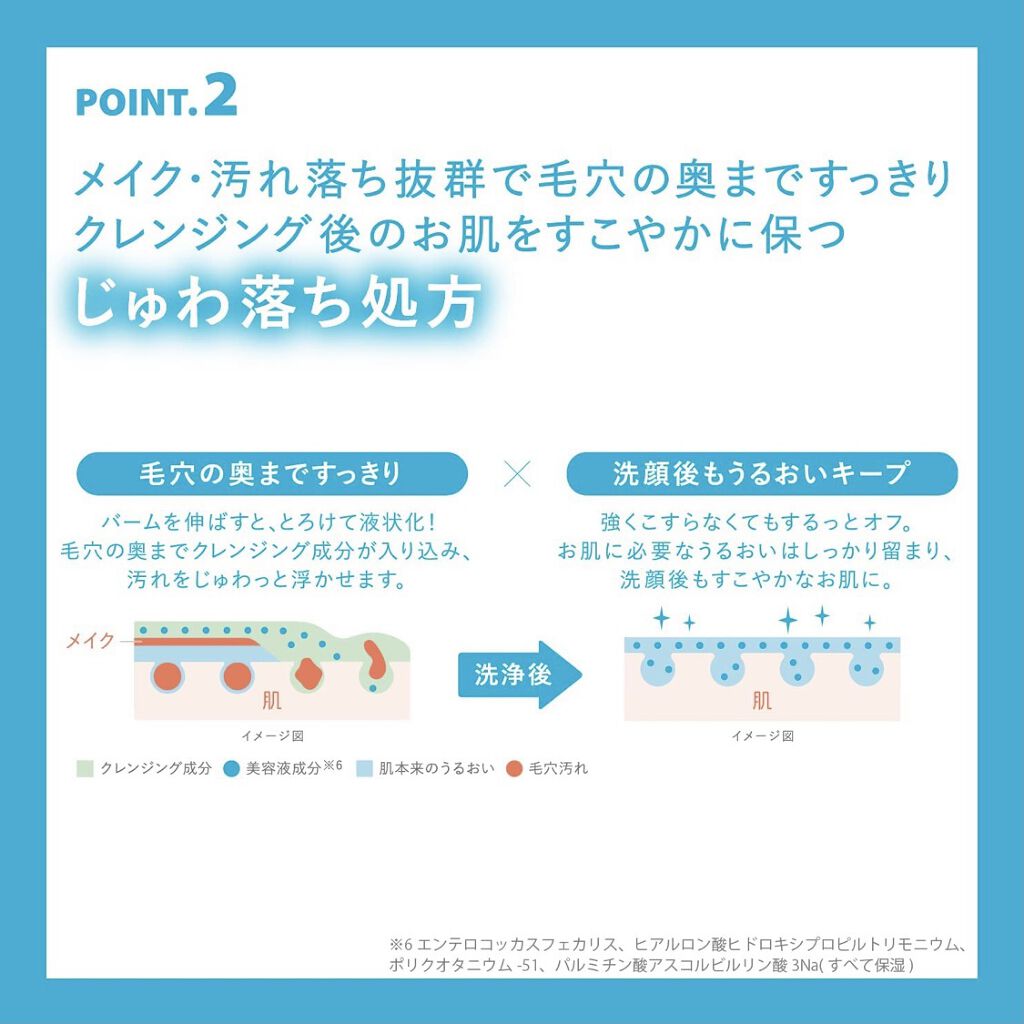 - 洗顔後のお肌の常在菌に着目。ラ・フローラ EC-12乳酸菌*1を配合し、うるおいを保つすこやかな美肌に導きます。さらに吸着型ヒアルロン酸*2、リピジュア®*3、ビタミンC誘導体*4配合のこだわり成分設計です。 クレンジング後のお肌をすこやかに保つじゅわ落ち処方を採用。こすらなくてもメイク・汚れ落ち抜群のとろけるバームで、毛穴の奥まですっきり。お肌に必要なうるおいはしっかり留まり、洗顔後もうるおいをキープします。これ1つで毛穴*5・角質*5・くすみ*5・うるおい不足・黒ずみ*9の5ケアが完了。W洗顔不要でまつ毛エクステンションもOK。スパチュラ付きで衛生的です。 *1 エンテロコッカスフェカリス(保湿) *2 ヒアルロン酸ヒドロキシプロピルトリモニウム(保湿) *3 ポリクオタニウム-51(保湿) *4 パルミチン酸アスコルビルリン酸3Na(保湿) *5 汚れや古い角質を洗い流すことによる