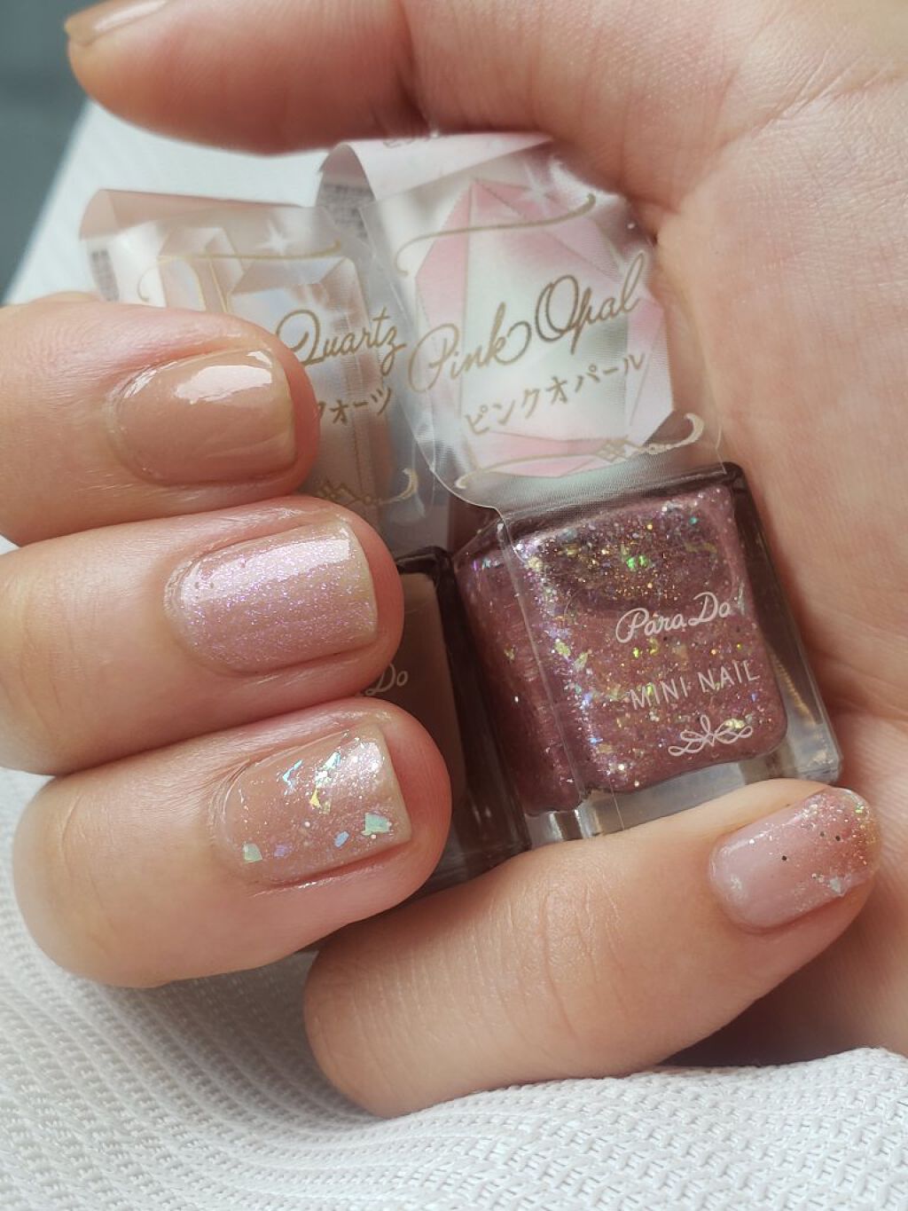 ポイントとしては、ガラスフレンチ部分は一息でやること…かな。 手順でいうと②~④だね。ベースにしたローズミルクティーが乾いたら、フレンチラインをひくところからメタルホロを貼り付けるところまでサッサッサッと💨 下準備として、メタルホロはちょうどいい大きさに切っておくと作業がスムーズ◎ それから、メタルホロを使うときは下にティッシュかキッチンペーパーを敷いておくと片付けもラク◎ 指一本ずつの作業だから、ネイルにかかる時間がかなり長くなるけど、やっぱりガラスフレンチは可愛い🖤