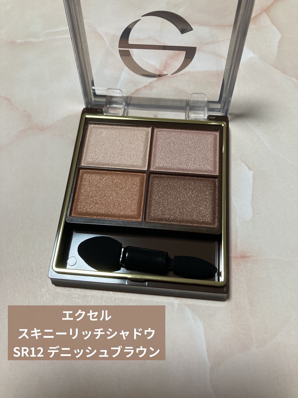 excelのスキニーリッチシャドウ可愛すぎるー🩷️ 何回もメイクに使いよる😂 右側の淡い色を重ねて、二重幅に濃いブラウンを重ねていきました(ღ✪v✪) お上品なキラキラ具合✨ こちらは、大好きな大好きな#gaho ちゃんにいただきました🎁