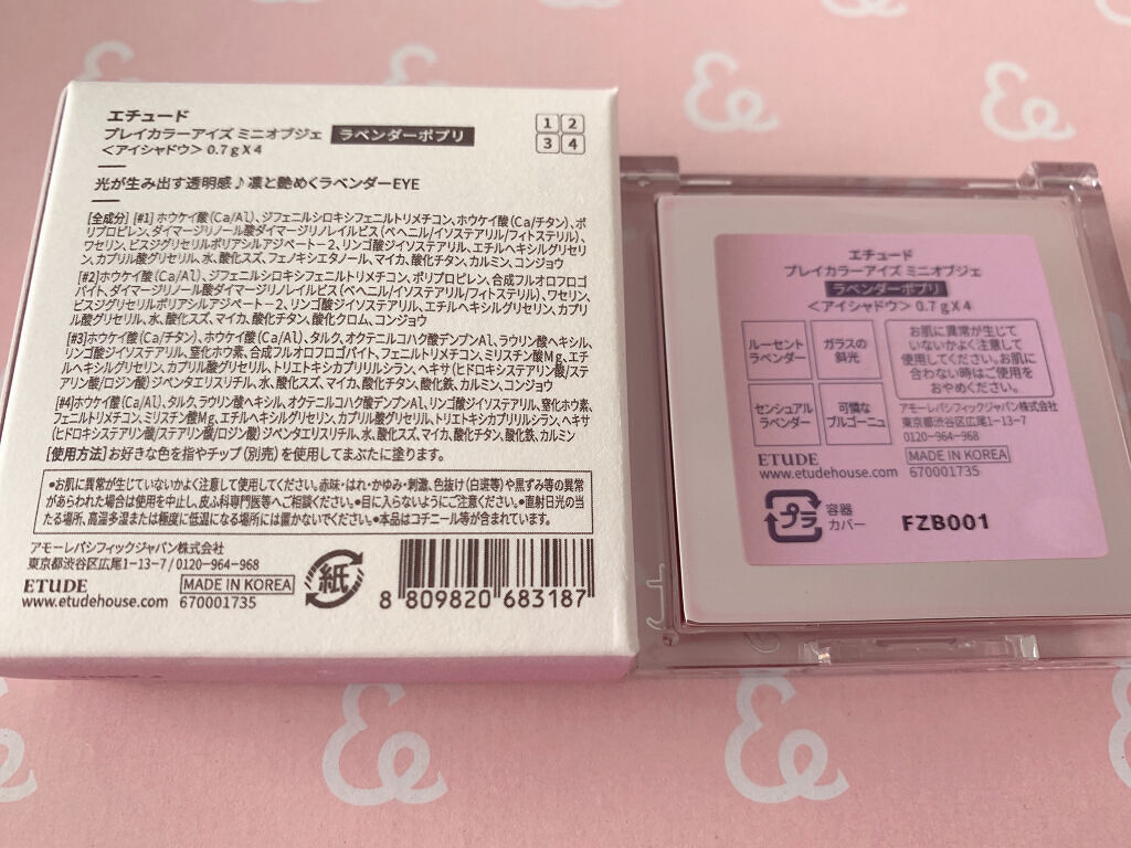 モニターに当選し、ETUDE様よりプレイカラーアイズ ミニオブジェの新色「ラベンダーポプリ」をいただきました! どの色も見た目そのままの発色ですが、右上の「ガラスの斜光」は見た目よりも肌馴染みが良いように感じます◎ 粉質は結構しっとりとしており、どの色もラメが繊細でかわいいです! また、蓋がだいぶ硬いので持ち運ぶ際も心配はいらなそうです◎