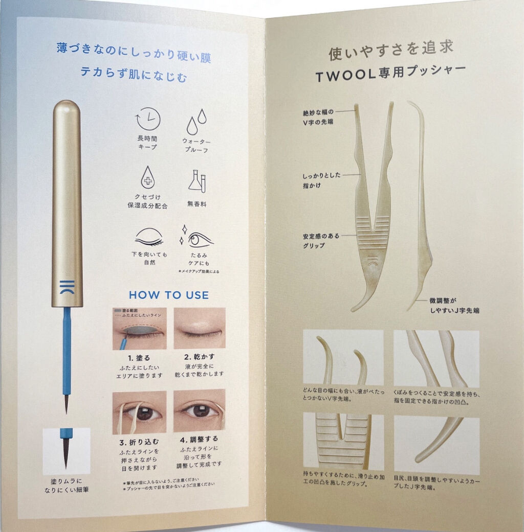 - 【感動の自然さ】 ・膜を作ってまぶたに折り込むタイプ ・ふたえの幅を広げたい方、ひとえの方へ ・今までの皮膜では叶わなかった方に ・薄付きなのにしっかり硬い膜でまぶたを支える ・テカらず肌になじむ ・天然ゴムラテックスフリーの新処方(シン・ラテックス) ・目元のハリケアにも*メイクアップ効果による ・クセ付け・保湿成分配合