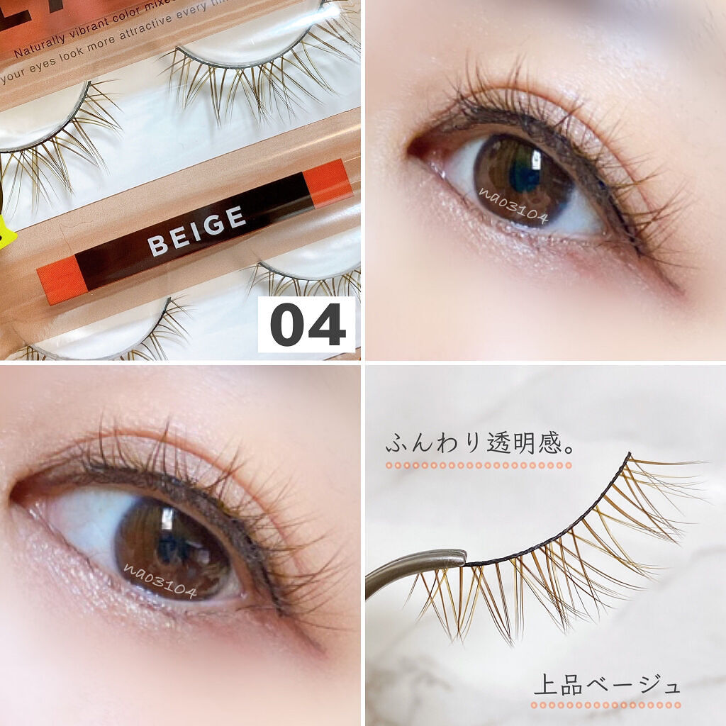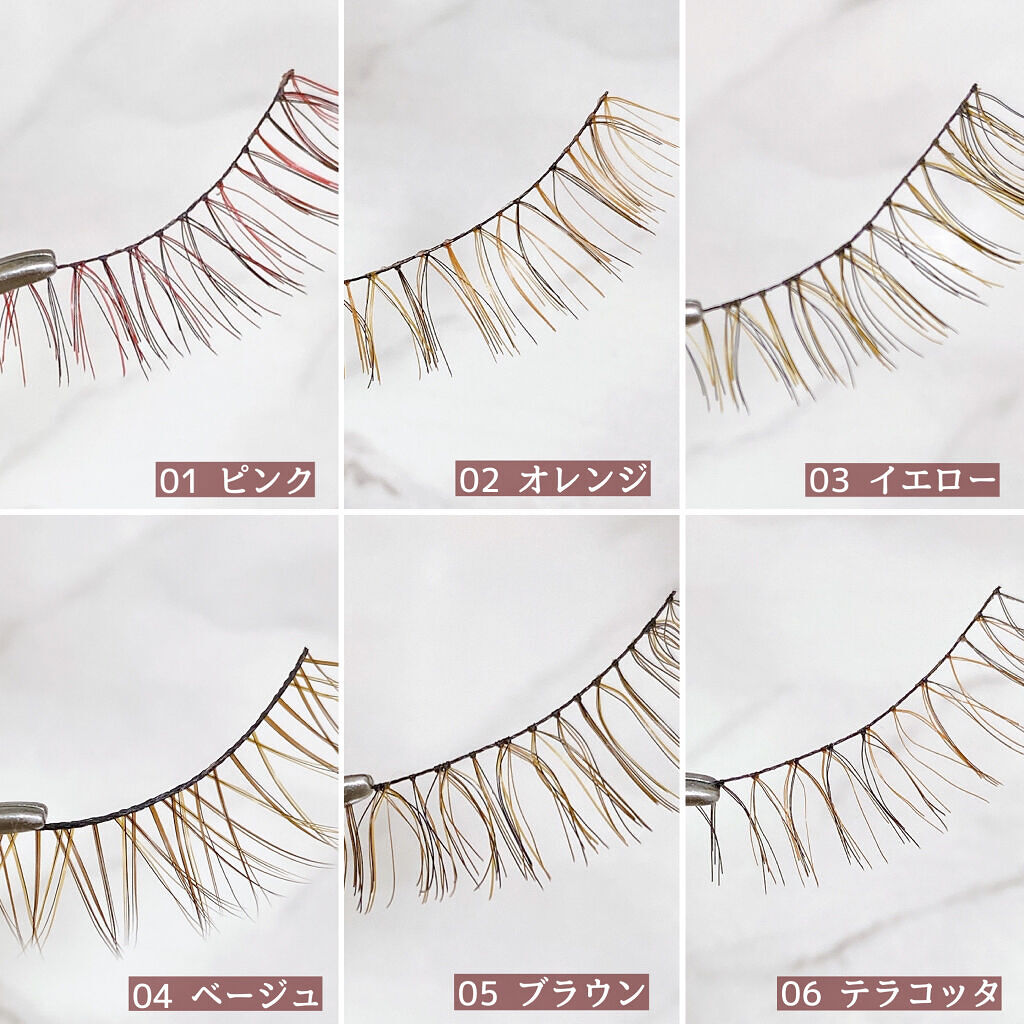 カラーマスカラよりも軽やかで繊細に、カラーマツエクよりも気軽に 休みの日のおしゃれを楽しめる シースルー発色でトレンド感満載のつけまつげ。 黒や茶色の毛とミックスされているので ポップになりすぎず、まつ毛の存在感も しっかりとアップしてくれるので 目元がぼやけず目力もばっちり。 グルーも本当に優秀で、 何年も現場でずっとリピートしてるお気に入りアイテム。