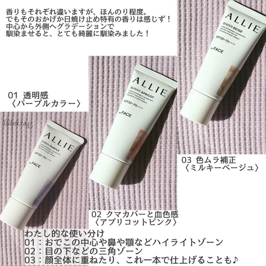 - 世界を想う 美しさつづく*1 日やけ止め おでかけも、マスクを外す機会も増える毎日に。 一部の国・地域・ビーチの規制に配慮した設計のビーチフレンドリー処方。 これ 1 本で、UV カット&顔色補整効果でクマ・くすみ・色ムラまでカバー! テカりにくく、くずれにくいノーファンデ UV*2 【ENNUI PURPLE】 くすみや毛穴をカバー 儚げな透明感のある顔印象続く 澄んだ気分を誘う 紫陽花しずく&セージの香り 【SUNNY APRICOT】 クマや毛穴をカバー いきいきとした血色感のある顔印象つづく 思わず出かけたくなる アプリコット&金木犀の香り 【SHERR BEIGE】 色ムラや毛穴をカバー 均一で抜け感のある顔印象つづく 自然で飾らない シトラスウッディ&パチュリの香り ●一部の国・地域・ビーチの規制に配慮した設計の「ビーチフレンドリー処方」 ●SPF50+・PA++++ ●汗・水 こすれに強く落ちにくい フリクションプルーフ・スーパーウォータープルーフ ●ベタつきにくい感触がつづく ●テカりにくくキレイな肌仕上がりがつづく ●環境に配慮した素材を使用したパッケージ採用 ●美容液成分(保湿)ヒアルロン酸Na配合 ●顔用 ●普段のメイククレンジングで落とせる ●マスク・タオル等につきにくい ●化粧下地効果 *1 スキンケア効果またはメイクアップ効果による肌仕上がりのこと *2 ファンデーション未使用時でも、自然なベースメイクが仕上がる日やけ止めのこと *3 チリ・ほこり・PM2.5・花粉等すべての微粒子汚れの付着を防ぐわけではありません 01:ENNUI PURPLE パープル 02:SUNNY APRICOT アプリコットピンク 03:SHEER BEIGE ミルキーベージュ
