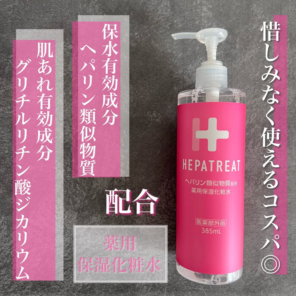 - ヘパトリートは保水有効成分のヘパリン類似物質と肌あれ有効成分のグリチルリチン酸ジカリウムを配合し、8つのフリーを実現。低刺激処方ながら高機能な化粧水です。さらに、薬用化粧水では珍しい大容量ポンプ(385mL)でとても使いやすく、赤ちゃんから大人まで、顔や全身の肌あれ・乾燥に使えます。 ■Wの有効成分 1.ヘパリン類似物質 顔・全身の乾燥を防ぐ 肌の乾燥による肌あれ/あれ性/皮膚を健やかに保つ/肌を整える/あせも/ひび/あかぎれ 2.グリチルリチン酸ジカリウム ニキビを防ぐ/肌をひきしめる/日やけ、雪やけ後のほてりを防ぐ/しもやけ/かみそりまけを防ぐ ■肌にやさしい低刺激処方<8つのフリー> 無香料/無着色/無鉱物油/無動物油/パラベンフリー/アルコールフリー/石油系界面活性剤フリー/シリコンフリー ※パッチテスト済み ※スティンギングテスト済み