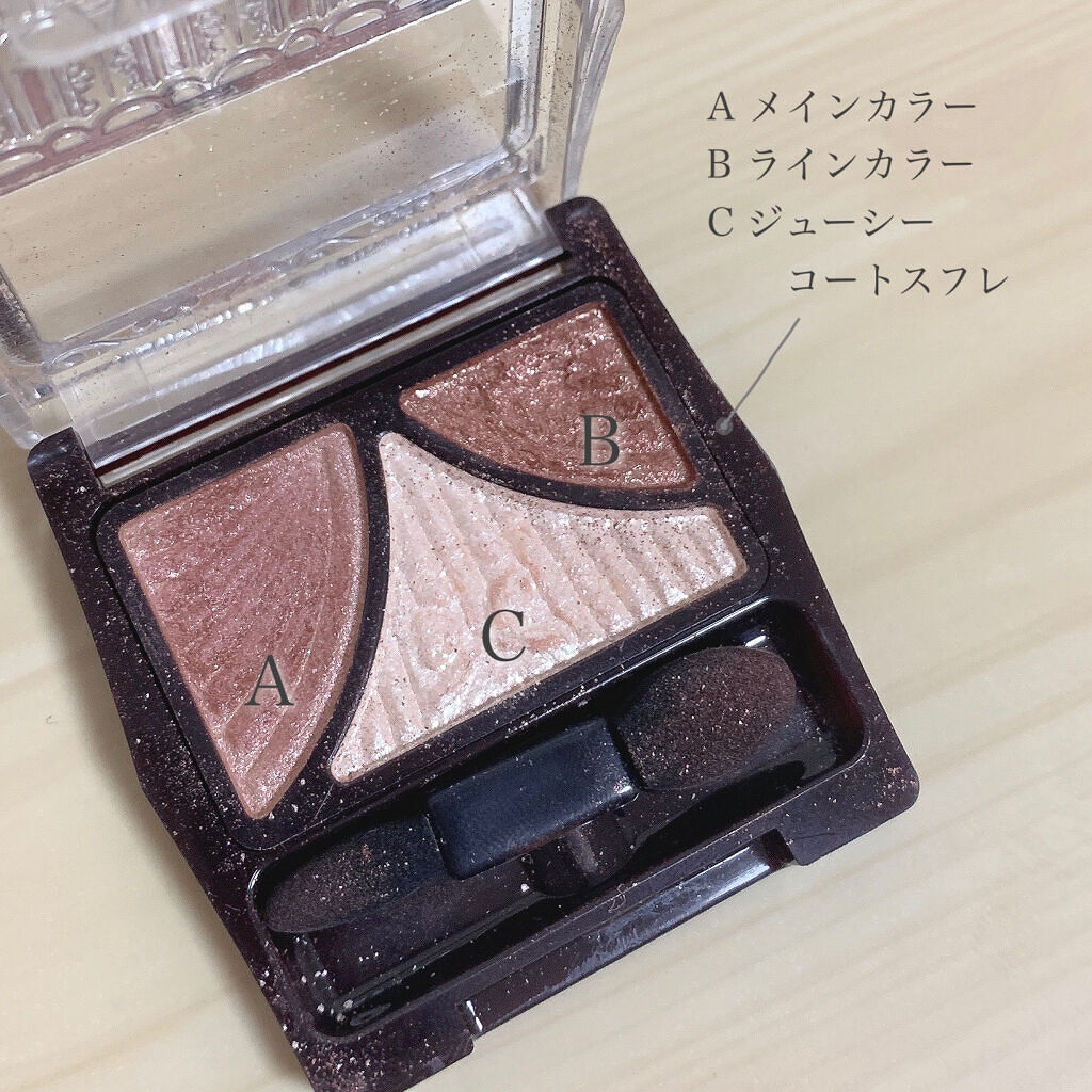 - パウダーなのにみずみずしい♥ 自然な立体感をつくりだす3色アイシャドウパレット 仕上げのコートで、ジューシー感&モチUP! メインカラー&ラインカラーはフィッティングオイル配合のしっとりパウダーで、 まぶたに吸いつくように溶け込み、ジューシーコートスフレで覆うことによって、 濡れたようにツヤめく愛されまぶたで透明感のある目元を演出します。