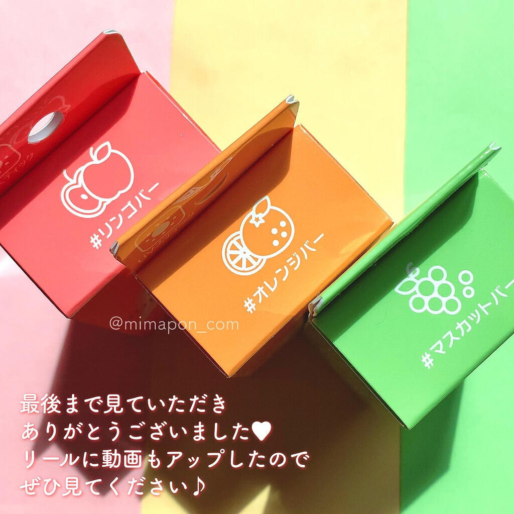 - <RD01 リンゴバー> ジ(カプリル/カプリン酸)BG、カプリル酸プロピルヘプチル、オクチルドデカノール、アジピン酸ジブチル、安息香酸フェネチル、ジブチルラウロイルグルタミド、ジフェニルシロキシフェニルトリメチコン、ジブチルエチルヘキサノイルグルタミド、ジエチルアミノヒドロキシベンゾイル安息香酸ヘキシル、ビスエチルヘキシルオキシフェノールメトキシフェニルトリアジン、安息香酸アルキル(C12-15)、エチルヘキシルトリアゾン、ダイマージリノール酸(フィトステリル/イソステアリル/セチル/ステアリル/ベヘニル)、ポリシリコーン-15、トリメリト酸トリトリデシル、パルミチン酸デキストリン、ナイアシンアミド、酢酸ジステアリン酸スクロース、トコフェロール、トリイソステアリン酸ポリグリセリル-2、ジイソステアリン酸ポリグリセリル-2、リンゴ種子油、香料、赤104(1) <OR01 オレンジバー> ジ(カプリル/カプリン酸)BG、カプリル酸プロピルヘプチル、オクチルドデカノール、アジピン酸ジブチル、安息香酸フェネチル、ジブチルラウロイルグルタミド、ジフェニルシロキシフェニルトリメチコン、ジブチルエチルヘキサノイルグルタミド、ジエチルアミノヒドロキシベンゾイル安息香酸ヘキシル、ビスエチルヘキシルオキシフェノールメトキシフェニルトリアジン、安息香酸アルキル(C12-15)、エチルヘキシルトリアゾン、ダイマージリノール酸(フィトステリル/イソステアリル/セチル/ステアリル/ベヘニル)、ポリシリコーン-15、トリメリト酸トリトリデシル、パルミチン酸デキストリン、ナイアシンアミド、酢酸ジステアリン酸スクロース、トコフェロール、トリイソステアリン酸ポリグリセリル-2、トリ(カプリル酸/カプリン酸)グリセリル、ヒポファエラムノイデス果実油、香料、黄5 <GR01 マスカットバー> ジ(カプリル/カプリン酸)BG、カプリル酸プロピルヘプチル、オクチルドデカノール、アジピン酸ジブチル、安息香酸フェネチル、ジブチルラウロイルグルタミド、ジフェニルシロキシフェニルトリメチコン、ジブチルエチルヘキサノイルグルタミド、ジエチルアミノヒドロキシベンゾイル安息香酸ヘキシル、ビスエチルヘキシルオキシフェノールメトキシフェニルトリアジン、安息香酸アルキル(C12-15)、エチルヘキシルトリアゾン、ダイマージリノール酸(フィトステリル/イソステアリル/セチル/ステアリル/ベヘニル)、ポリシリコーン-15、トリメリト酸トリトリデシル、パルミチン酸デキストリン、ナイアシンアミド、酢酸ジステアリン酸スクロース、トコフェロール、トリイソステアリン酸ポリグリセリル-2、ブドウ種子油、香料、青1 <パインアメ(限定)> ジ(カプリル/カプリン酸)BG、カプリル酸プロピルヘプチル、オクチルドデジ(カプリル/カプリン酸)BG、オクチルドデカノール、アジピン酸ジブチル、安息香酸フェネチル、ジブチルラウロイルグルタミド、ジフェニルシロキシフェニルトリメチコン、ジブチルエチルヘキサノイルグルタミド、ジエチルアミノヒドロキシベンゾイル安息香酸ヘキシル、ビスエチルヘキシルオキシフェノールメトキシフェニルトリアジン、安息香酸アルキル(C12-15)、エチルヘキシルトリアゾン、ダイマージリノール酸(フィトステリル/イソステアリル/セチル/ステアリル/ベヘニル)、ポリシリコーン-15、トリメリト酸トリトリデシル、パルミチン酸デキストリン、トリ酢酸テトラステアリン酸スクロース、トコフェロール、テトラヘキシルデカン酸アスコルビル、ナイアシンアミド、香料