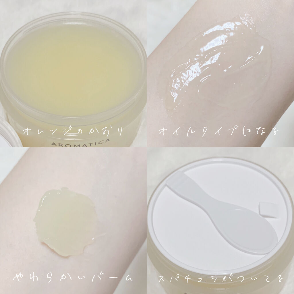 バームが肌にのせるととろっととろけて、厚みのあるオイルのようなテクスチャーに。 しっとりとした洗い上がりで冬にもおすすめの使用感。ダブル洗顔不要のやさしさも感じられます。 アロマティカらしい、ほんのり香る甘くほろ苦いオレンジも好き!