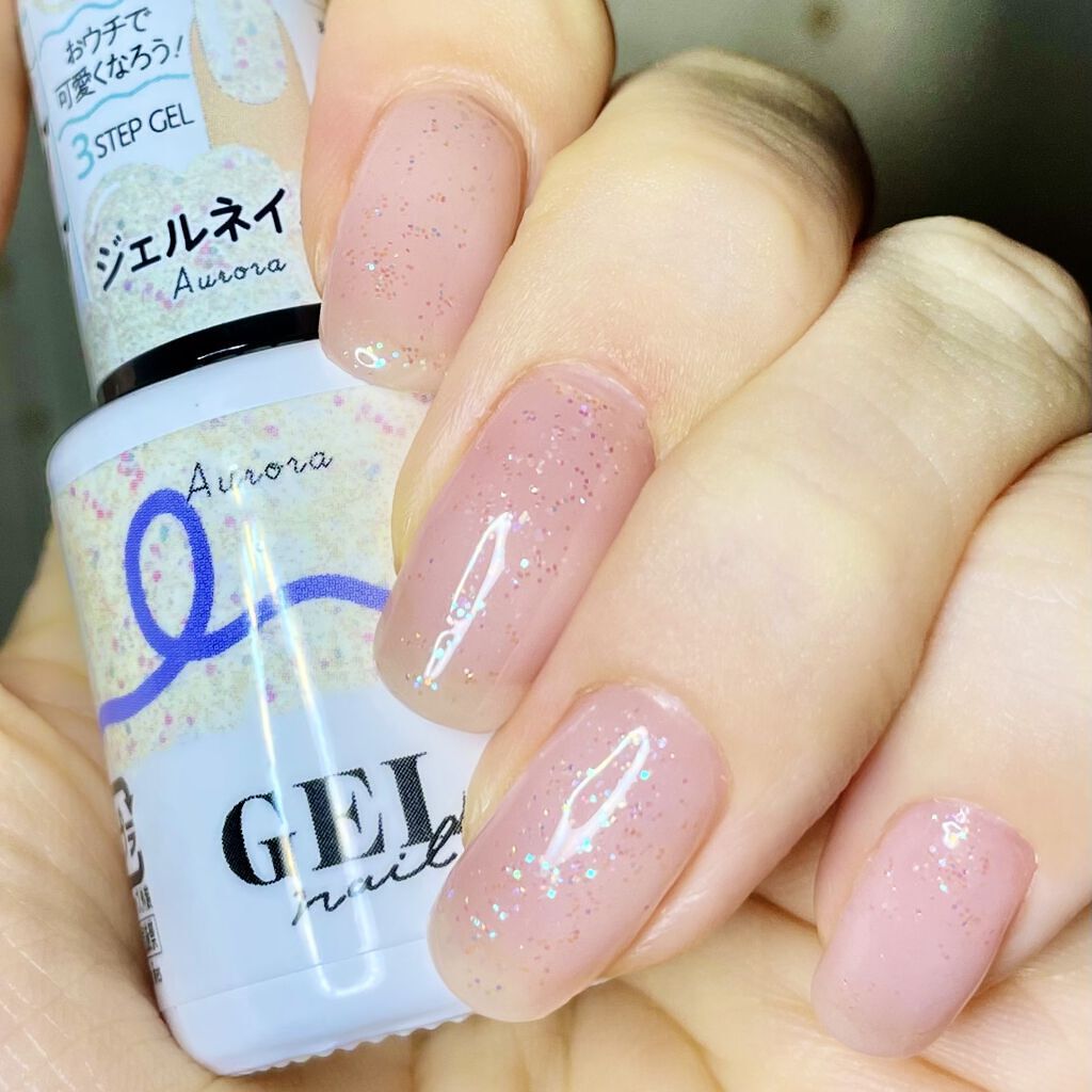 DAISO BRGジェルネイル9オーロラ Auroraクリアなベースにオーロララメぎっしり✨たまに六角ホロや細長いホロが混ざってます。ラメだけなら大丈夫ですが、ホロを塗ると表面がボコっとしやすいです💦写真は2度塗り。キラッキラで夏らしい涼しさ...