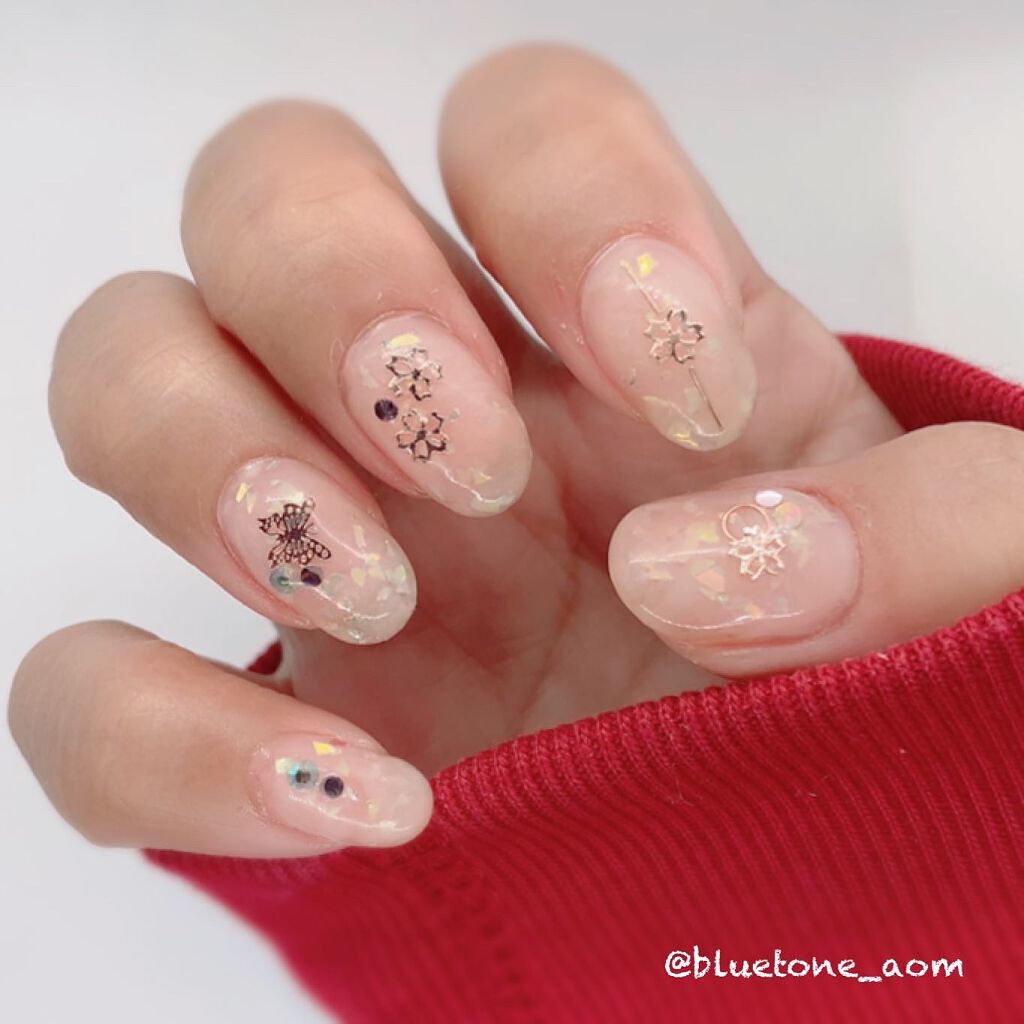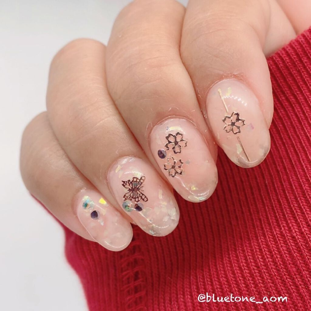 ラメがしっかりしてるし クリアカラーが入ってるから オーロラパウダー無しでも 充分キラキラしました! 反射強めのフィルムなので 実物はもっと うるうるとキラキラが強いです! ビー玉みたい🥺 ネイルシール長持ちさせたいけど ちょっと飽きてきたな〜って時とかに 全然違った印象になるのでオススメです! Seriaのベースジェル 本当にうるうるネイルしやすいので オススメしたい🙆♀️
