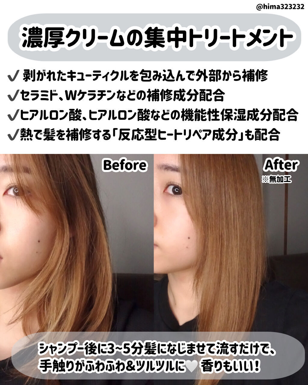 | ヘアケア・スタイリングランキング第52位 | めちゃくちゃかわいいヘアトリートメント!お風呂上がりはサラサラ感強めのしっとり♡ | 詳細を見る | |