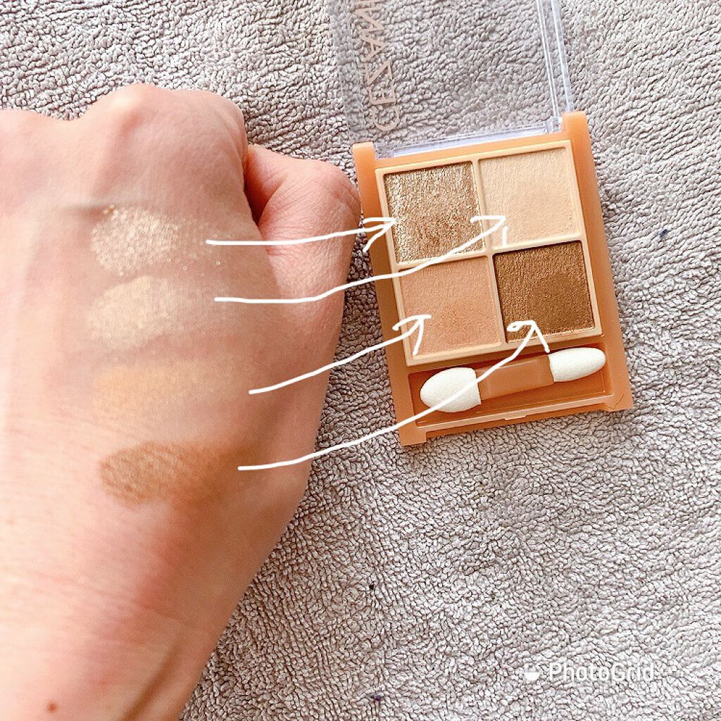 - ラメ・パール・マット3質感の4色アイシャドウ。 肌馴染みの良いベージュを基調としたカラー。ラメ・パール・マットの3質感を重ねて、自然にまぶたを強調し奥行のある大きな目元へ。 しっとり溶け込むような柔らかなパウダーなので、スルスル伸びてまぶたにピタッと密着。保湿成分(スクワラン・ホホバ種子油)配合。