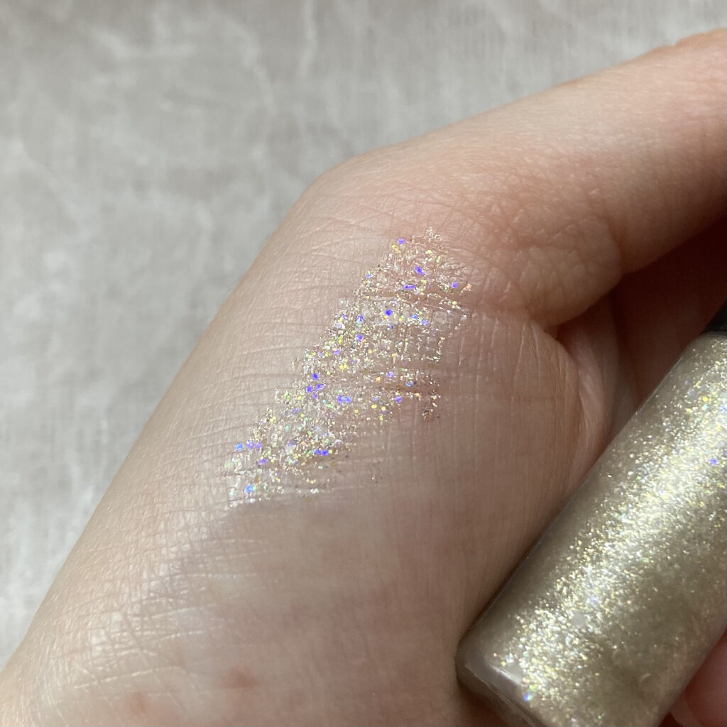 - 大粒すぎないから使いやすい! 高輝度ラメたっぷりのカラフルグリッター ラメの粒子サイズを大きくしすぎないことで、 悪目立ちしない絶妙な輝きに仕上げました。 ベース液にパールを多めに配合しているため、 サラッと控えめに塗ってもしっかり輝きます! やわらかく使い勝手の良い極細筆で、狙ったところにラメをオン! ☆使い方☆ 下まつげのキワに沿って 本品で細くアイラインを引くと、 オーロラに輝く印象的な目元の完成!