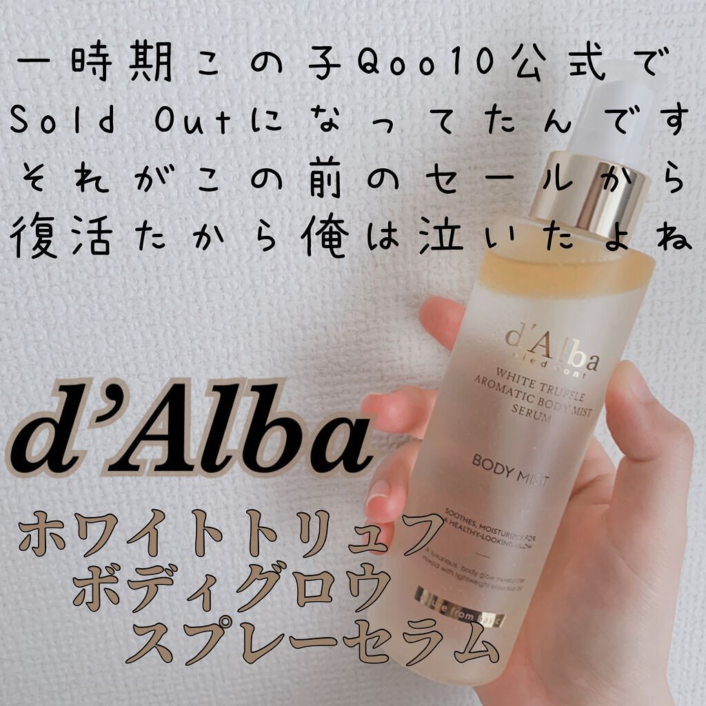 ダルバホワイトトリュフアロマティックボディミストセラムセラムとオイルが絶妙なバランスで配合されていて、しっとりするのにべたつきません✨肌にすっとなじんで、なめらかさとふっくら感を感じました🫶🏻キー成分はイタリア産ホワイトトリュフ(※)とトコフ...