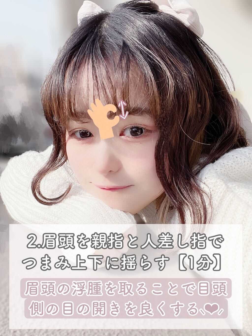 私はかなり存在感のある蒙古襞がありました😣 でも、二重の癖をつけるためのマッサージと並行してこのマッサージも約1年続けて来て、今では蒙古襞は昔と比べると無くなってきて目の形も変わりました!! 蒙古襞が無いと二重の幅も広くできるので今は末広から並行二重を目指しています💕 とっても簡単なマッサージなんですけど、続けることで目頭がしっかり開いてくるので、まずは1ヶ月続けて見ましょう♡♡ 私は朝メイク前に二重マッサージと並行してやっています!! また、アイプチをするとより瞼が上に引っ張られるので蒙古襞も無くしやすいと思います💕