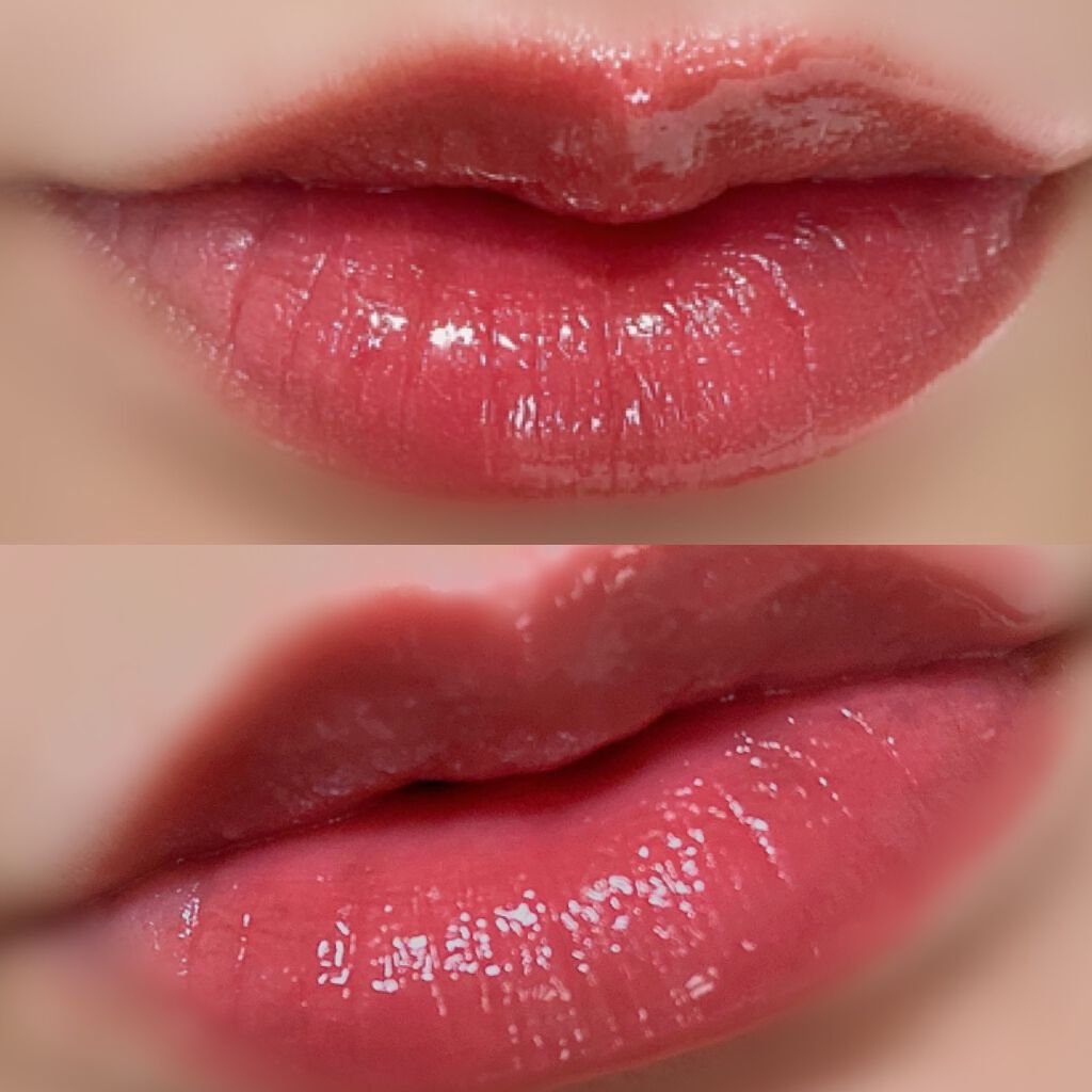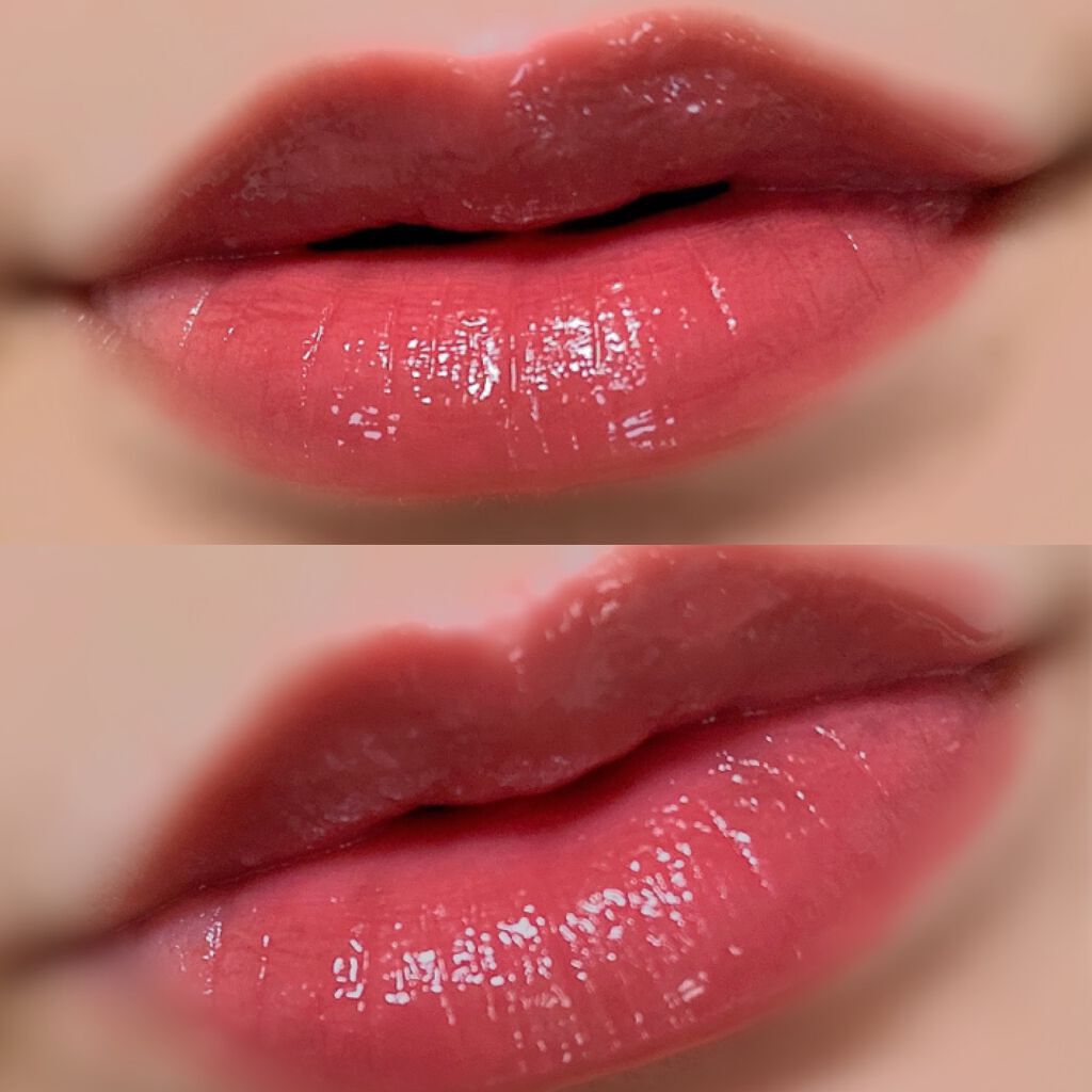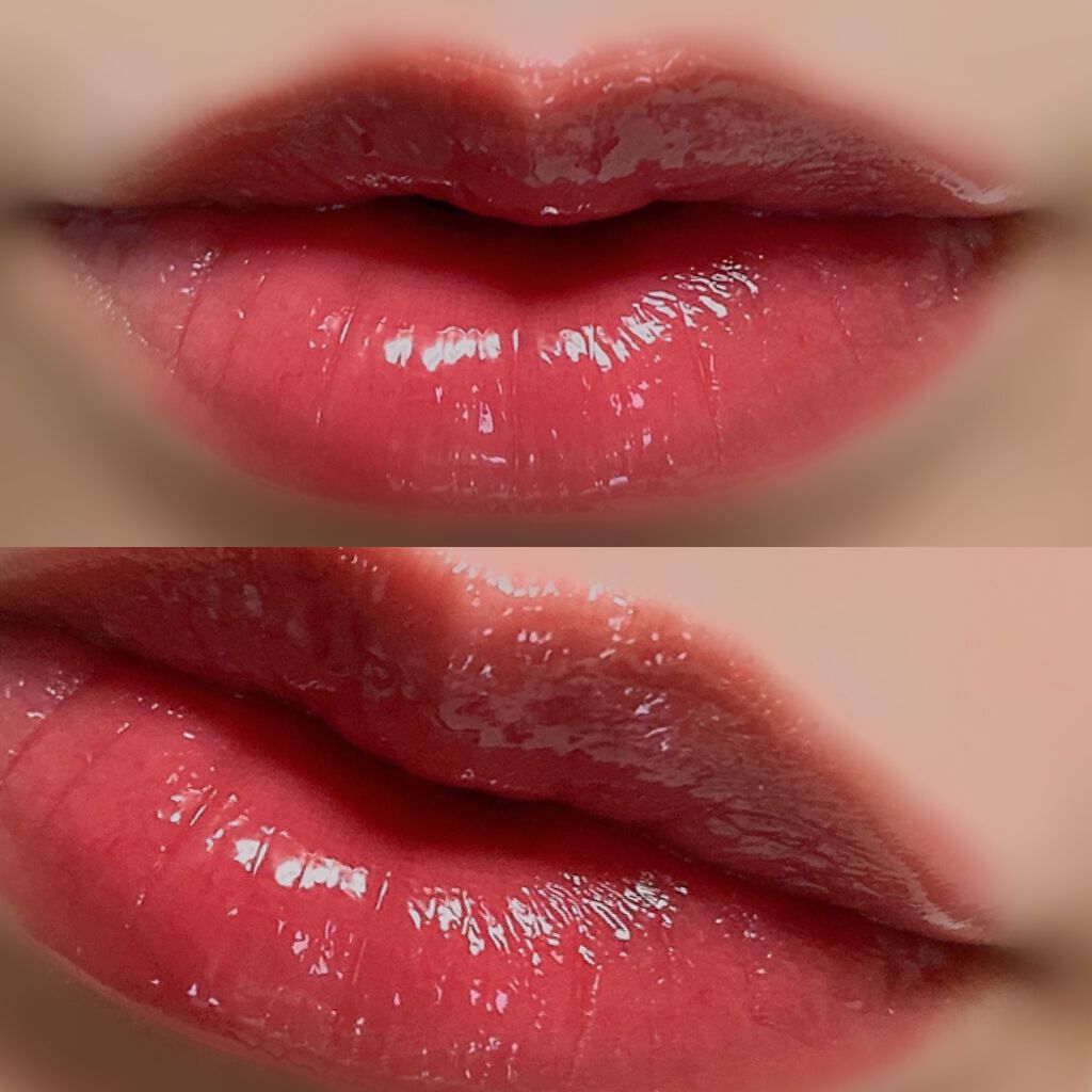 クールトーンのピンクベージュカラー 私の肌や唇だと青みと赤みのあるピンクベージュに発色しました。ブルベさんが得意そうな色。ツヤが可愛い💕 私はイエベですが、透け感があるから薄く塗れば使えるかなと思いました。 ジューシーラスティングティントは香りが強めなイメージだったから使ったことなかったけど、塗って時間をおけばそんなに気にならなかったから、リニュ後の買ってみようかな🫶