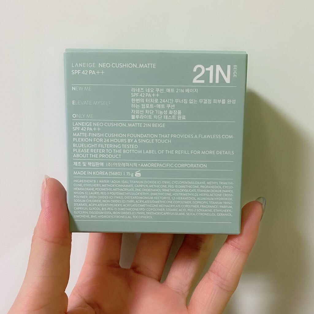 - 肌にぴたっと密着することで、24時間*¹崩れにくい ナチュラルマット肌に仕上げる世界中で大人気のクッションファンデーション *¹当社調べ、個人差があります。 1.VIVID COVERAGE ™(ヴィヴィッドカバレッジ) 技術を採用 LANEIGEクッション史上最も小さいパウダーが、 しっかりカバーなのに重くなく、軽い付け心地とナチュラルな仕上がりを実現しました。 塗りなおしても厚塗り感がなく、カラーメイクをさらにひきたてます。 2.高い密着力を実現したStrong Fixing Formula™ (ストロングフィクシングフォーミュラー )技術を採用し、 皮脂や汗に強くマスクやスマートフォンにも ファンデーションがつきにくい肌に仕上げます 3.皮脂コントロールパウダー配合で汗や皮脂による崩れを防ぎ、 肌のうるおいを閉じ込め乾燥しずらい、ナチュラルなセミマット肌を実現します。 4.アモーレパシフィック初のブルーライトカット効果採用のクッション スマフォやPCといった電子機器、LEDや蛍光灯から発せられるあらゆるブルーライトから肌をプロテクトします。