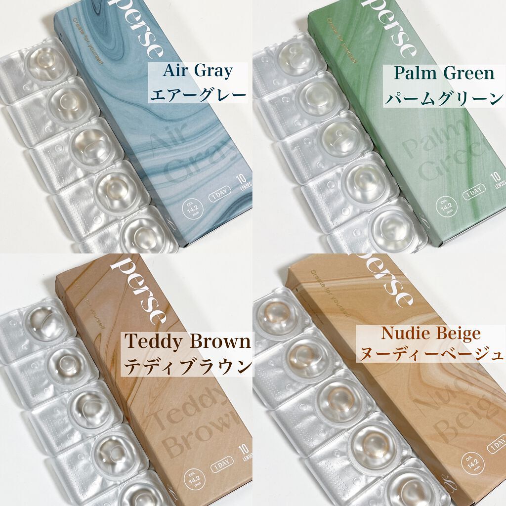 - ※2025年6月以降、商品パッケージ裏面・側面の一部表記を順次変更いたします。尚、これにかかる商品の交換・返品は承っておりません。 『perse(パース)』は、裸眼の美しさを引き出しながら、自由自在に印象の変化を楽しむ次世代カラーコンタクトレンズブランドとして誕生しました。 黒目でも茶目でも、どんな瞳のトーンにも似合う透け感発色と、光を集める繊細なグラデーションで、瞳の大きさを変えずにニュアンスチェンジ。 自分だけの特別な色が見つかる。 <Air Gray(エアーグレー)> DIA:14.2mm/着色直径:12.6mm 淡い光を宿すライトベージュに、ふわりと曖昧な空気を纏ったニュアンスグレー。 <Koala Gray(コアラグレー)> DIA:14.2mm/着色直径:13.6mm パールの光を閉じ込めた、ハートを射止めるドーリーグレー。 <Sunny Bear(サニーベア)> DIA:14.5mm/着色直径:13.8mm おひさま光を閉じ込めた、うるうるくりんっラブリーブラウン。 <Teddy Brown(テディブラウン)> DIA:14.2mm/着色直径:13.0mm さりげなく瞳の輪郭が際立つ、甘くイノセントな表情のダークアッシュブラウン。 <Nudie Beige(ヌーディーベージュ)> DIA:14.2mm/着色直径:12.6mm あたたかなブラウンヴェールの隙間から、きらめきを放つまばゆいライトベージュ。 <Palm Green(パームグリーン)> DIA:14.2mm/着色直径:13.0mm クリーンな雰囲気で澄んだ目元に、前向きな気持ちになれるフレッシュグリーン。 カラーコンタクトレンズの不適正使用による眼障害の危険性等などがあります。 ●コンタクトレンズは高度管理医療機器です。不十分な洗浄・消毒など不適切なケアや、長時間・交換期間を超えた装用により、アレルギー性結膜炎、角膜感染症、角膜潰瘍等の重篤な眼障害が発生する危険性があります ●ご使用前に取扱説明書を確認してください 使用上の留意事項 ●眼科医院等を受診してからお求めください ●眼に異常を感じたら直ちにレンズ使用を中止し、お近くの眼科等で診察を受けてください ●医師の指示にしたがってご使用ください ●コンタクトレンズを装用する場合、自覚症状がなくても、眼科医院等での定期検査を受けてください ●レンズに不具合がある場合は使用しないでください