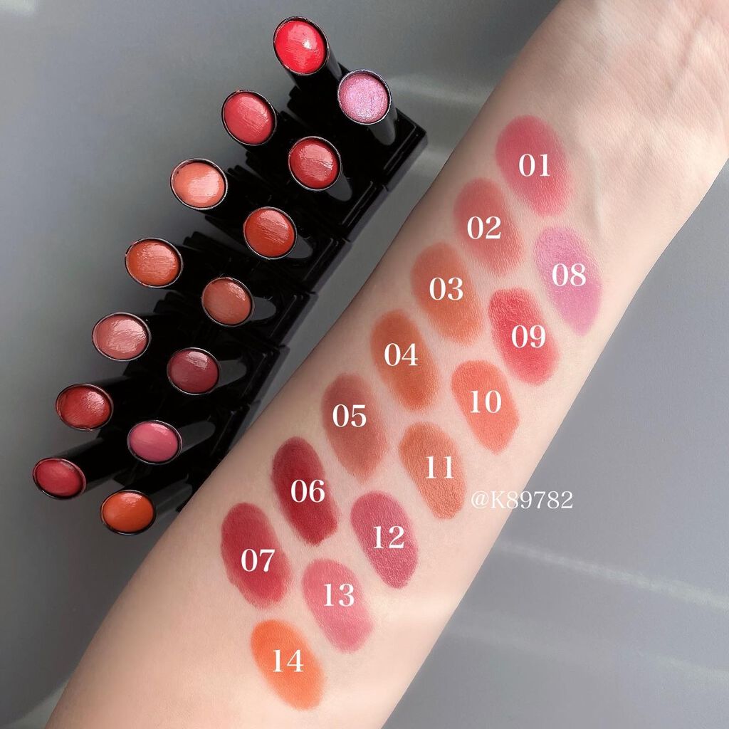 ドラスト探し回ってやっっと揃ったバズリップ😭 1度塗り、2度塗り、ティッシュオフまでどんな塗り方でも可愛いのすごくないですか?? 全色塗ったので色選びの参考になれば幸いです🙋🏻♀️ 01,02,03,07は日常使いしやすい定番カラー、04,05,06はケイトらしいダークでお洒落なカラー揃い🦇 個人的には05,06がお気に入り。もう圧倒的に可愛いです😭😭 特に05は完売してる店舗が多かった印象。 01と07は一見似てますが、01は透明感のあるレッドピンクで07は上品なくすみローズ系。キリッと顔を引き締めたい時は01を、大人っぽく見せたい時は07を選ぶことが多いです! 口紅なのに可愛い色とツヤをキープできて落ちにくいの本当に天才すぎて…👏🏻 こんなに全色可愛い、欲しい!と思ったのは初めて。マスク生活には欠かせない優秀リップです😷