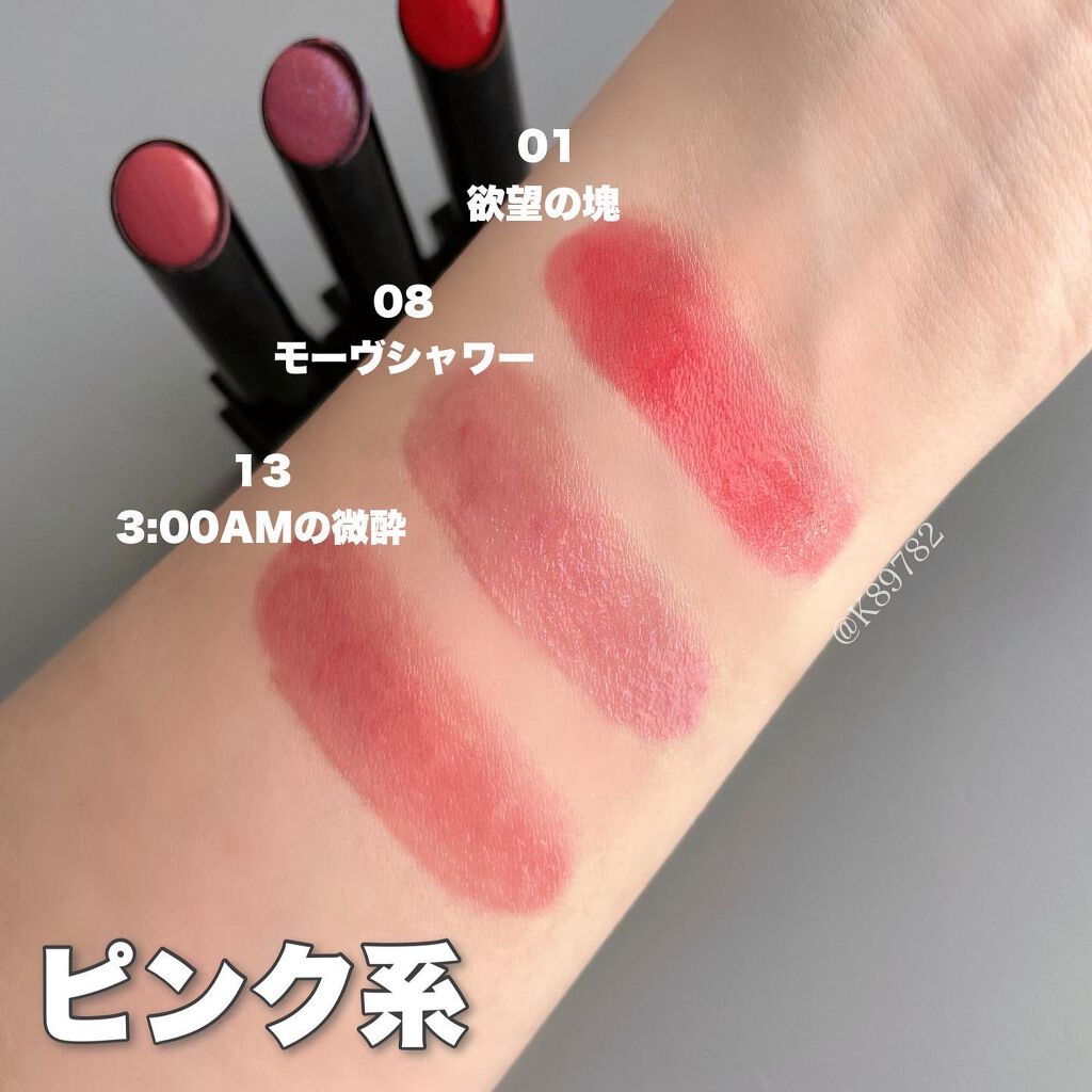 - <01 欲望の塊> テトライソステアリン酸ジペンタエリスリチル、トリ(カプリル酸/カプリン酸)グリセリル、オクチルドデカノール、ラウロイルグルタミン酸ジ(フィトステリル/オクチルドデシル)、ビスアルキル(C16-18)グリセリルウンデシルジメチコン、イソノナン酸イソトリデシル、水添ポリイソブテン、ラウロイルグルタミン酸ジ(オクチルドデシル/フィトステリル/ベヘニル)、パラフィン、合成ワックス、ダイマージリノール酸(フィトステリル/イソステアリル/セチル/ステアリル/ベヘニル)、マイクロクリスタリンワックス、水添マイクロクリスタリンワックス、ヒドロキシステアリン酸エチルヘキシル、トコフェロール、ホホバ種子油、オリーブ果実油、アーモンド油、(エチレン/プロピレン)コポリマー、ポリエチレン、ジメチコン、(+/-)(チタン/酸化チタン)焼結物、マイカ、ラウロイルアスパラギン酸Na、ラウロイルリシン、塩化亜鉛、酸化チタン、酸化鉄、水酸化Al、硫酸Ba、トリイソステアリン酸イソプロピルチタン、酸化スズ、ホウケイ酸(Ca/Al)、合成フルオロフロゴパイト、黄4、黄5、赤104(1)、赤201、赤202 <02 ピンクバナナ> テトライソステアリン酸ジペンタエリスリチル、トリ(カプリル酸/カプリン酸)グリセリル、オクチルドデカノール、ラウロイルグルタミン酸ジ(フィトステリル/オクチルドデシル)、ビスアルキル(C16-18)グリセリルウンデシルジメチコン、イソノナン酸イソトリデシル、水添ポリイソブテン、ラウロイルグルタミン酸ジ(オクチルドデシル/フィトステリル/ベヘニル)、パラフィン、合成ワックス、ダイマージリノール酸(フィトステリル/イソステアリル/セチル/ステアリル/ベヘニル)、マイクロクリスタリンワックス、水添マイクロクリスタリンワックス、ヒドロキシステアリン酸エチルヘキシル、トコフェロール、ホホバ種子油、オリーブ果実油、アーモンド油、(エチレン/プロピレン)コポリマー、ポリエチレン、ジメチコン、(+/-)(チタン/酸化チタン)焼結物、マイカ、ラウロイルアスパラギン酸Na、ラウロイルリシン、塩化亜鉛、酸化チタン、酸化鉄、水酸化Al、硫酸Ba、トリイソステアリン酸イソプロピルチタン、酸化スズ、ホウケイ酸(Ca/Al)、合成フルオロフロゴパイト、黄4、黄5、赤104(1)、赤201、赤202 <03 陽炎> テトライソステアリン酸ジペンタエリスリチル、トリ(カプリル酸/カプリン酸)グリセリル、オクチルドデカノール、ラウロイルグルタミン酸ジ(フィトステリル/オクチルドデシル)、ビスアルキル(C16-18)グリセリルウンデシルジメチコン、イソノナン酸イソトリデシル、水添ポリイソブテン、ラウロイルグルタミン酸ジ(オクチルドデシル/フィトステリル/ベヘニル)、パラフィン、合成ワックス、ダイマージリノール酸(フィトステリル/イソステアリル/セチル/ステアリル/ベヘニル)、マイクロクリスタリンワックス、水添マイクロクリスタリンワックス、ヒドロキシステアリン酸エチルヘキシル、トコフェロール、ホホバ種子油、オリーブ果実油、アーモンド油、(エチレン/プロピレン)コポリマー、ポリエチレン、ジメチコン、(+/-)(チタン/酸化チタン)焼結物、マイカ、ラウロイルアスパラギン酸Na、ラウロイルリシン、塩化亜鉛、酸化チタン、酸化鉄、水酸化Al、硫酸Ba、トリイソステアリン酸イソプロピルチタン、酸化スズ、ホウケイ酸(Ca/Al)、合成フルオロフロゴパイト、黄4、黄5、赤104(1)、赤201、赤202 <04 パンプキンワイン> テトライソステアリン酸ジペンタエリスリチル、トリ(カプリル酸/カプリン酸)グリセリル、オクチルドデカノール、ラウロイルグルタミン酸ジ(フィトステリル/オクチルドデシル)、ビスアルキル(C16-18)グリセリルウンデシルジメチコン、イソノナン酸イソトリデシル、水添ポリイソブテン、ラウロイルグルタミン酸ジ(オクチルドデシル/フィトステリル/ベヘニル)、パラフィン、合成ワックス、ダイマージリノール酸(フィトステリル/イソステアリル/セチル/ステアリル/ベヘニル)、マイクロクリスタリンワックス、水添マイクロクリスタリンワックス、ヒドロキシステアリン酸エチルヘキシル、トコフェロール、ホホバ種子油、オリーブ果実油、アーモンド油、(エチレン/プロピレン)コポリマー、ポリエチレン、ジメチコン、(+/-)(チタン/酸化チタン)焼結物、マイカ、ラウロイルアスパラギン酸Na、ラウロイルリシン、塩化亜鉛、酸化チタン、酸化鉄、水酸化Al、硫酸Ba、トリイソステアリン酸イソプロピルチタン、酸化スズ、ホウケイ酸(Ca/Al)、合成フルオロフロゴパイト、黄4、黄5、赤104(1)、赤201、赤202 <05 ダークフィグ> テトライソステアリン酸ジペンタエリスリチル、トリ(カプリル酸/カプリン酸)グリセリル、オクチルドデカノール、ラウロイルグルタミン酸ジ(フィトステリル/オクチルドデシル)、ビスアルキル(C16-18)グリセリルウンデシルジメチコン、イソノナン酸イソトリデシル、水添ポリイソブテン、ラウロイルグルタミン酸ジ(オクチルドデシル/フィトステリル/ベヘニル)、