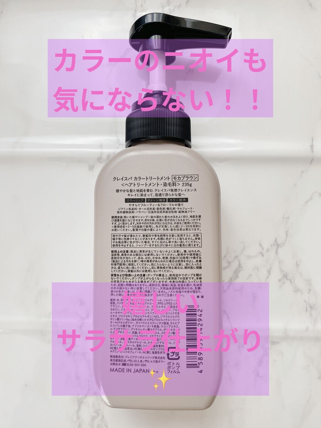 - 5分で美しい髪色へ 負担なく染めるクレイスパ発想の極上トリートメントカラー 髪と頭皮を育む5 種のクレイ※1 を配合したカラートリートメント。 髪に塗布したら5分で洗い流すだけ。 髪や頭皮を傷めることなく、透明感のある美しい髪色に染め上げます。 同時に白髪の根本原因にアプローチしながら、美しく強い黒髪を育む黒髪プラス成分※2 や地肌ケア成分 ※3 も配合。 さらに、カラーリング効果に加えてこだわったのがトリートメント効果。カラーの流出を守りながら、髪のダメージを補修し、なめらかな指通りとつややかな髪へ。髪色は好みに合わせて選べる4色をラインナップ。 ※1 カオリン、イライト、モンモリロナイト(吸着成分)、フムスエキス、流紋岩末(保湿成分) ※2 ヘマチン、アセチルヘキサペプチド-1(毛髪補修成分) ※3 アセチルテトラペプチド-3、アカツメクサ花エキス、ポリクオタニウム-110、ジヒドロキシプロピルアルギニンHC( l 毛髪補修・保湿成分)
