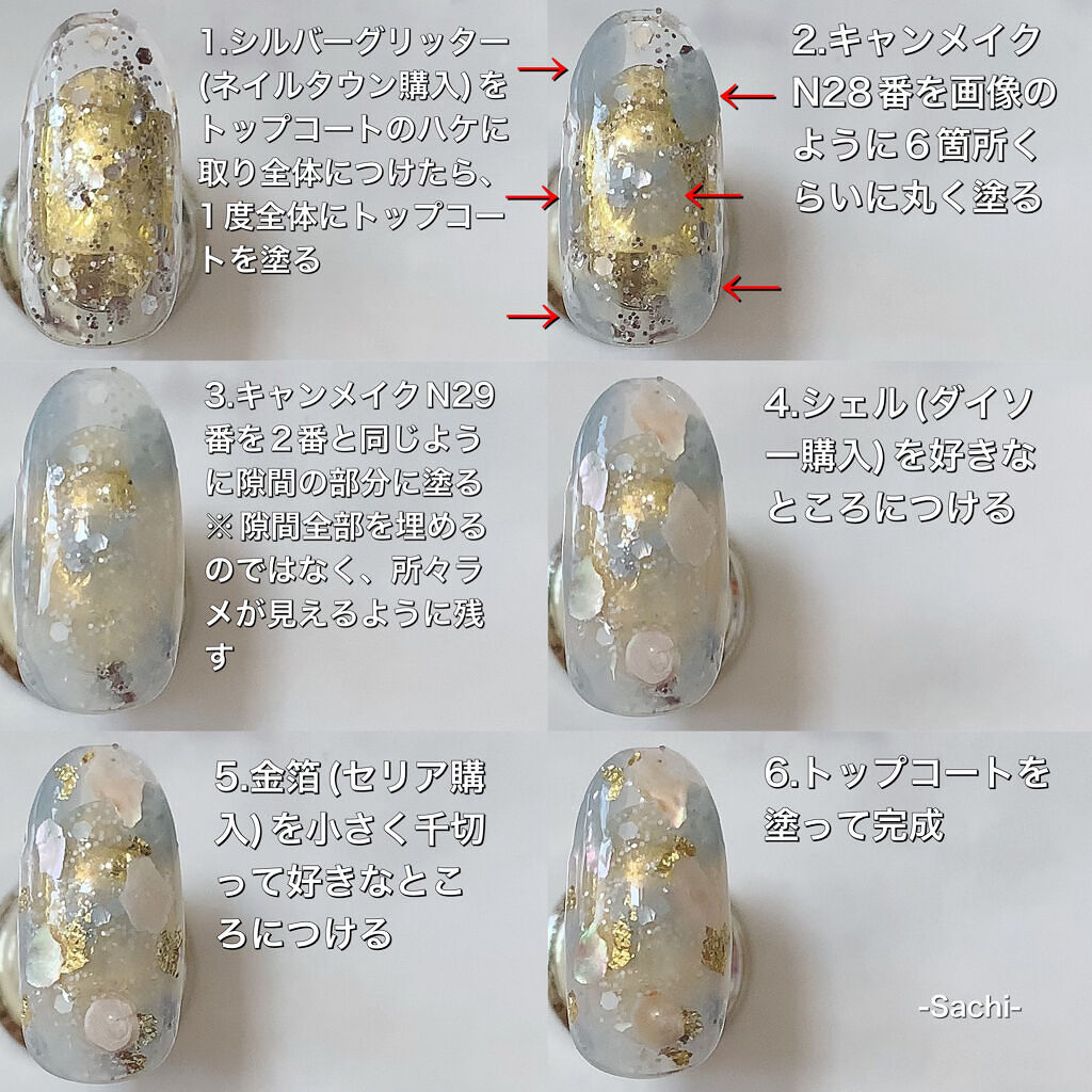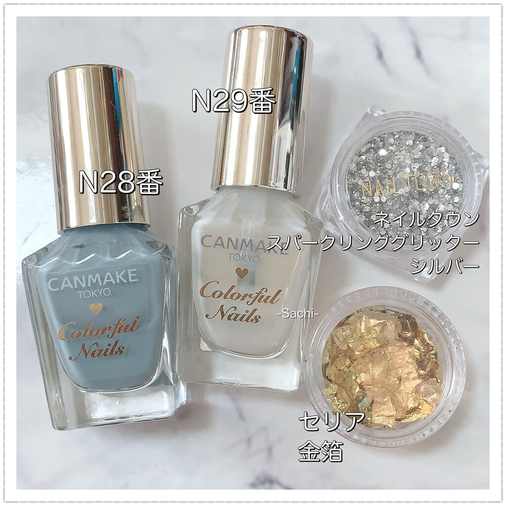 キャンメイクカラフルネイルズ N29ミルクシロップ N82クラウドレススカイ 親指、人差し指、小指は爪先にSV082で細いラインを描き、中指、薬指はAA225を重ねました。 ベースコート、トップコートはネイルホリックのものを使っています。