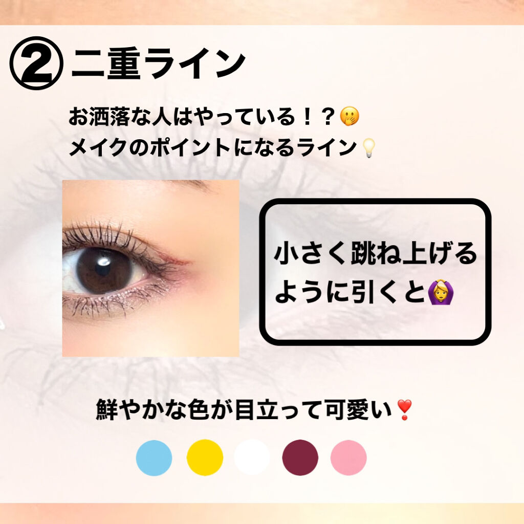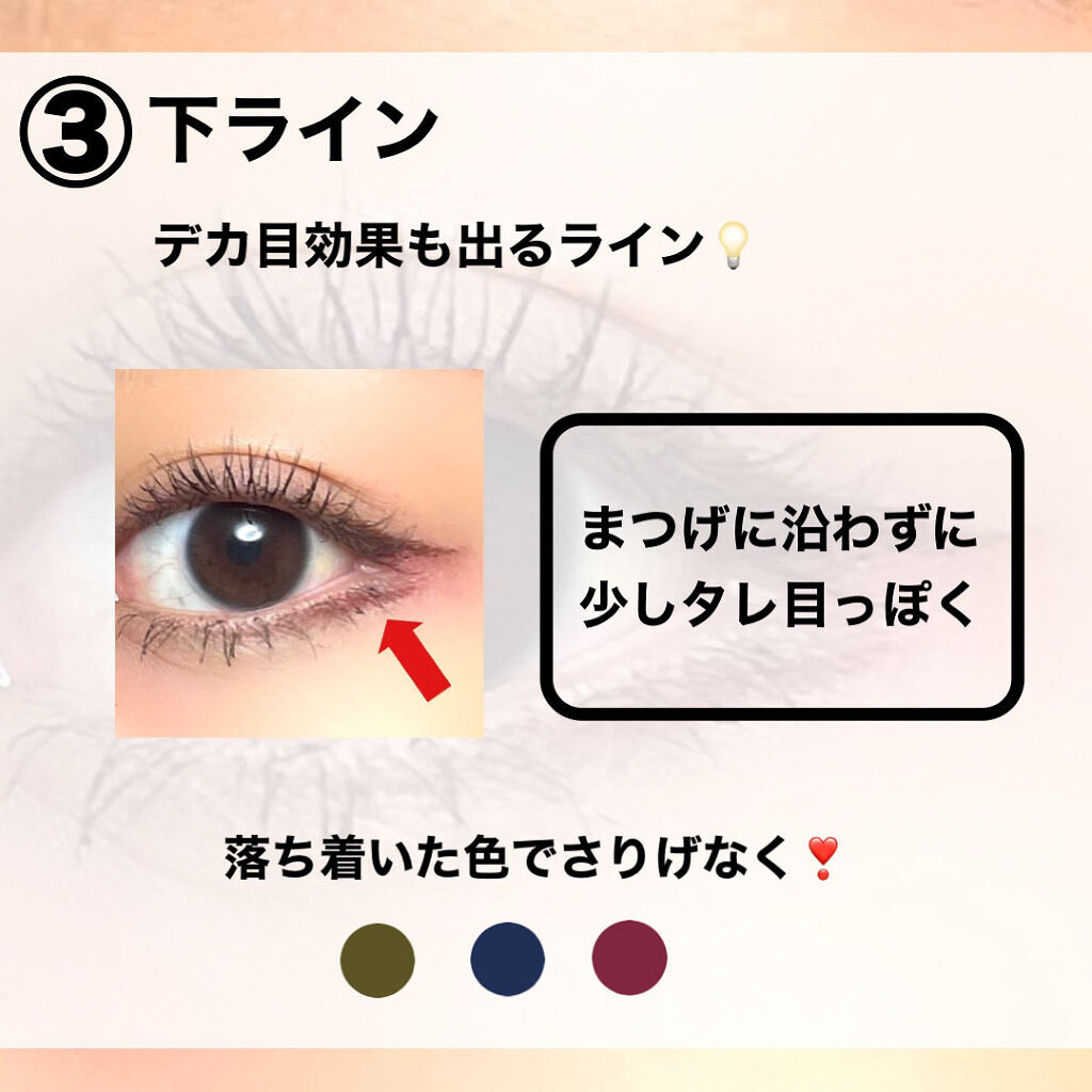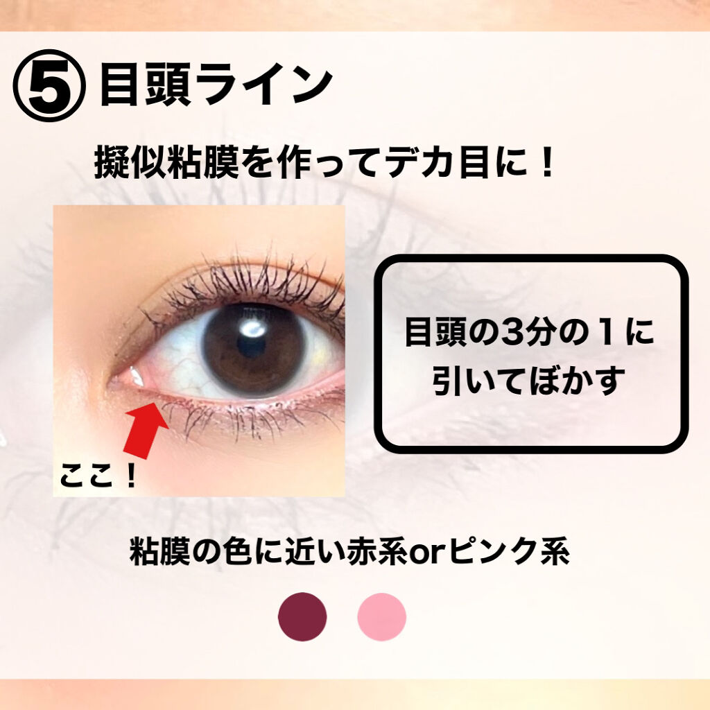 締め色を広くのせる アイシャドウの暗めの色を幅広くのせると まつげが目立ちにくくなってしまう💧 締め色は正面から見た時に まつげの先端よりも狭い範囲にしよう🙆♀️ 眉が明るすぎる 垢抜けには眉を明るく!とよく言うけど 明るくしすぎると悪目立ちして 目のインパクトが弱くなるよ⚠️ バランスが大事☝️ コンシーラーをキワまで塗る 陰影を出してくれる涙袋や まつげのキワまで塗ってしまうと 目がキュッと小粒にみえるよ🙅♀️ コンシーラーは涙袋より下に!