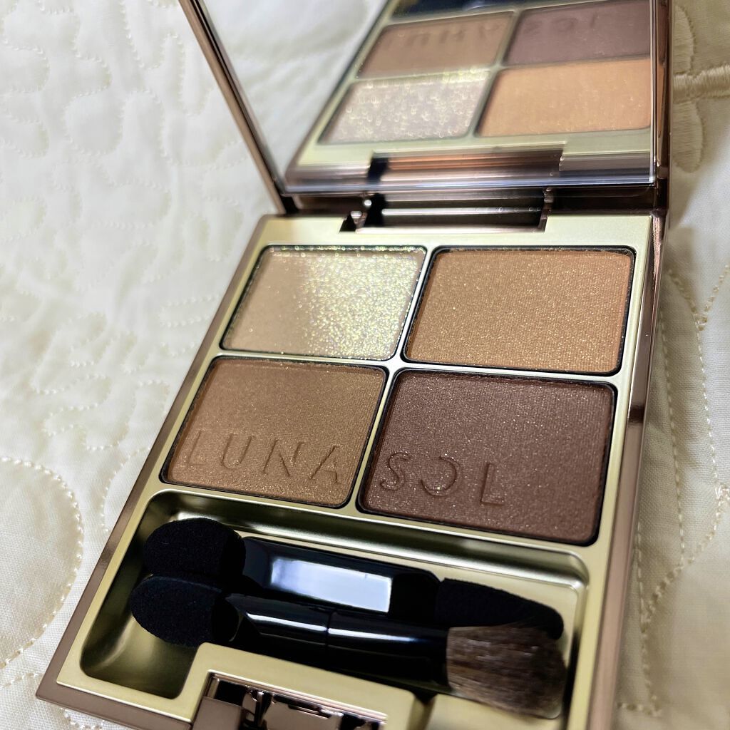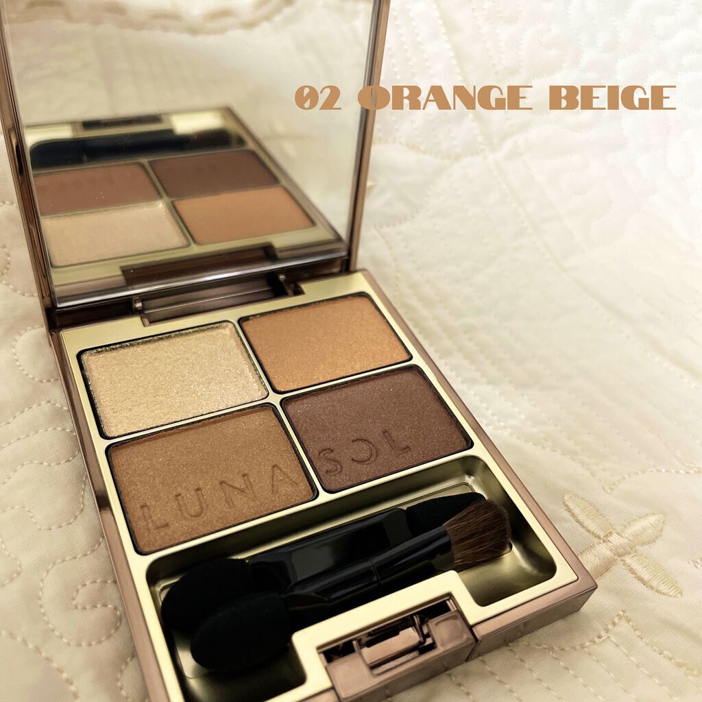 LUNASOLのアイシャドウパレットです❁⃘*.゚ ベージュ系の色味の中にオレンジが入っていて目元が暗くなりすぎず使いやすいです♪ 全てパール質感になっていて綺麗なツヤ感も出ます。 ブラウンすぎると目元が重たく見えるのでこのオレンジが入っているカラーだと明るく見えてよかったです!