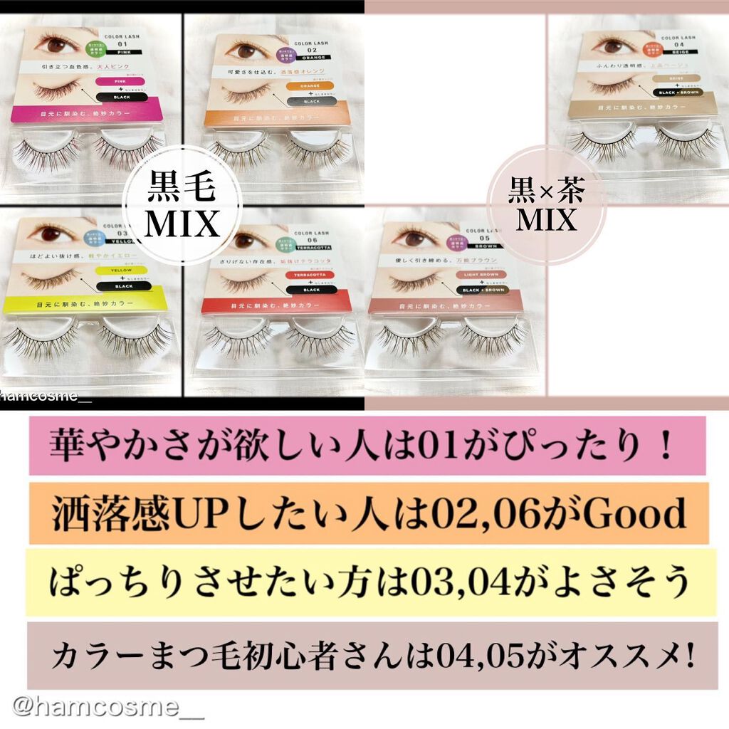- 光にあたると透けるような発色で、カラーエクステの“透明感”が簡単に叶う、『カラーラッシュ』。 目もとに馴染む絶妙なバランスでMIXしたカラーは、顔から浮かず自然な仕上がりに。 カラーの透明感で目もとをふわっと軽く魅せます。 ピンク・オレンジ・イエロー・ベージュ・ブラウン・テラコッタの全6色。