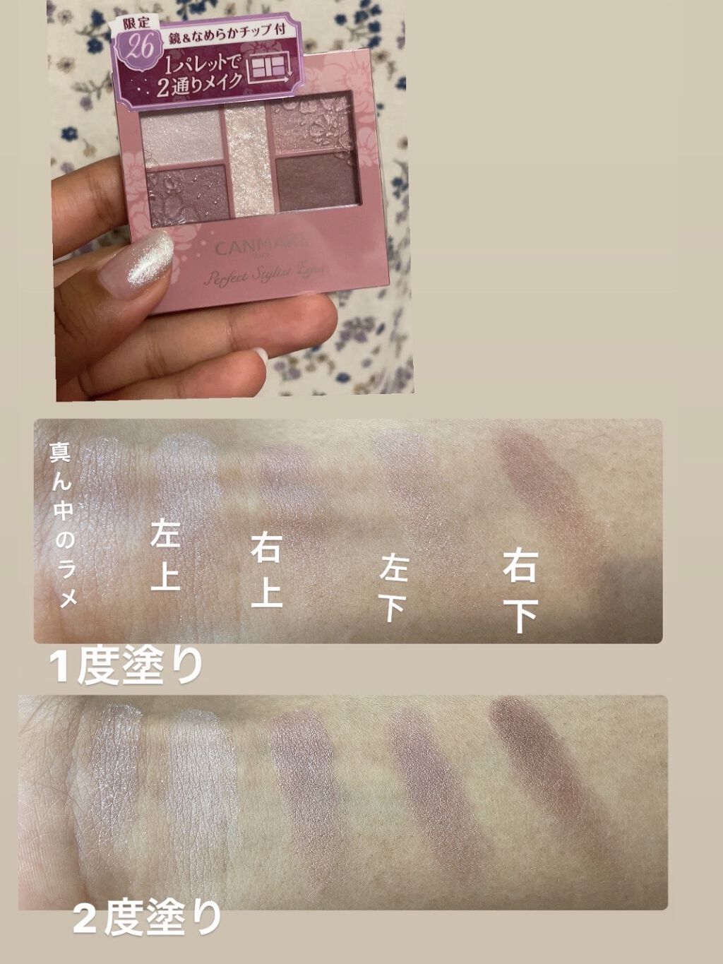 - 1枚のパレットで2つのスタイルが完成! 5色の欲ばりアイシャドウ♥ メインカラーを選んで2つのスタイルが楽しめる! A→B→D でスタイル1 A→C→D でスタイル2 繊細な粉質が、しっとりとまぶたに密着して色落ちを防ぎます。 透明感のあるキラうるトッピングジュエル(繊細ラメ)は、気分によってトッピング!
