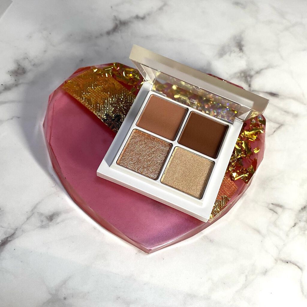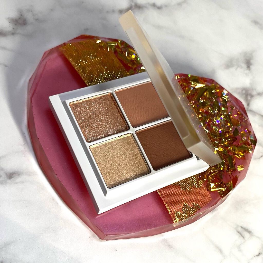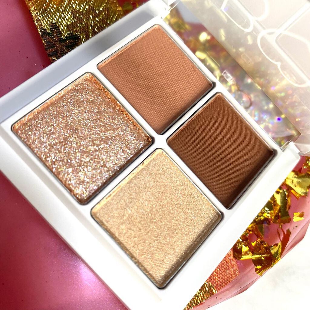 モーブカラーとラメとでとっても可愛いアイシャドウです! 左上はラメカラー。 ゴールド系のツヤっとしたラメで華やかな印象! 右上はシアーなピンク。 しっとりとした粉質の柔らかい青みピンクです! 左下はマットなモーブピンク。 しっかり発色するモーブカラー! 右下はモーブ系のラメカラー。 ぶどうのような色味にラメがぎっしりと! どの色味をメインに使うかによってメイクの雰囲気も大きく変わります🙆🏻♀️ どの色味も共通してしっとりとした粉質です! 石鹸落ちなので、持ちが抜群かと聞かれたらそうではないですが 普段使いでヨレなどが気になることはありません🪞