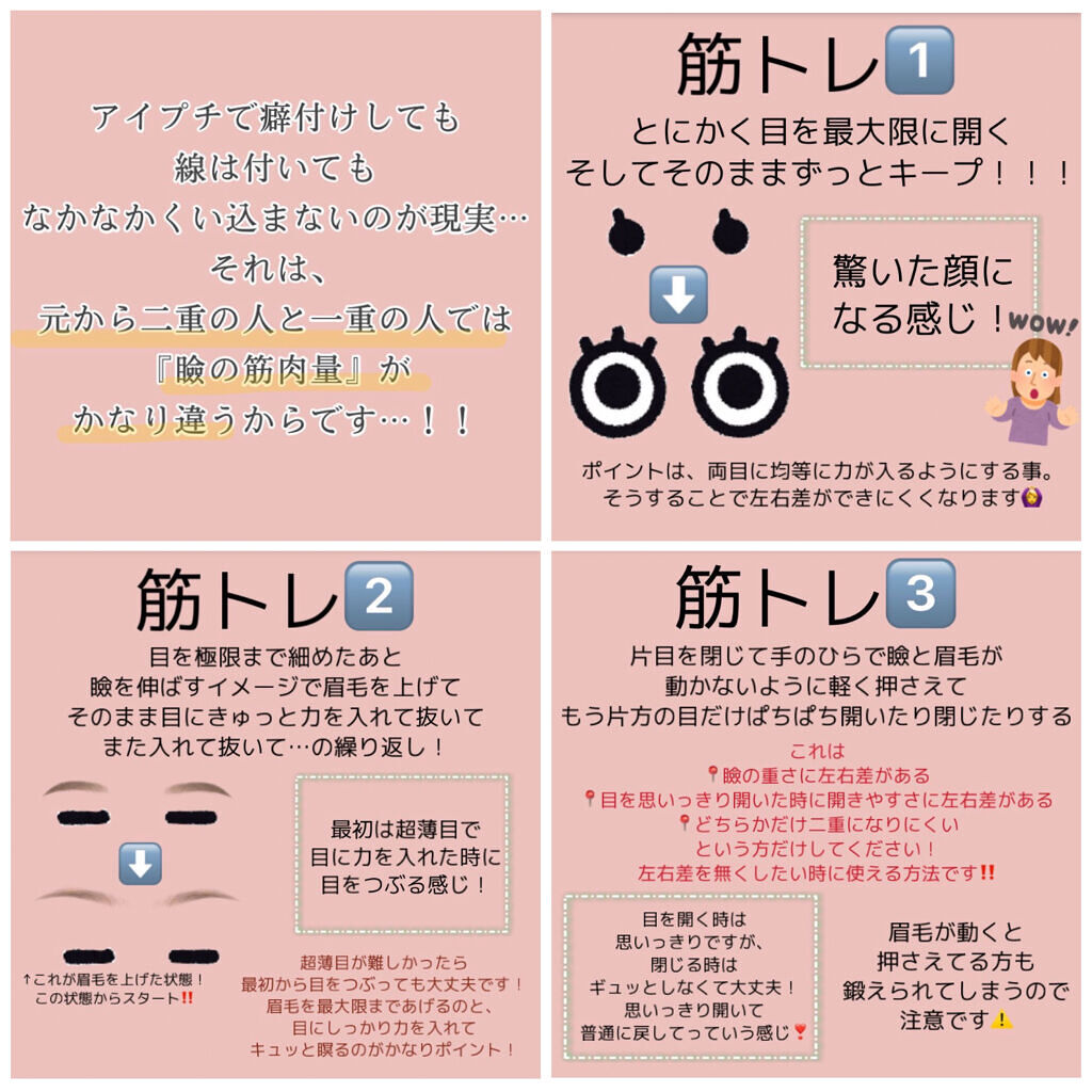 【瞼の筋トレ】について詳しく解説!!これさえすれば絶対変われます!!!瞼の筋トレって?という方は、画像をご覧下さい‼️これがないと私は今頃二重になってなかった…と言っても過言ではないくらい、私の癖付けには欠かせなかったものです!!今回は、昔からしている筋トレ1つと、最近思いついて実践している筋トレ2つをご紹介します!!どれもすごく簡単なので、ぜひ試してみてください📷Q 一日どのくらいしてた?A とにかく暇さえあればしていました!!1日30分の日もあれば、何時間もする日もありましたこの筋トレは、お風呂に入りながらや勉強しながら、スマホ見ながらでもできるのがいいところなので、スキマ時間を上手く活用するのがいいかな思います💭Q 今まで何回くらい筋肉痛になった?A 左右どちらも5回くらいだと思います!瞼が私より軽い方は、1、2回で十分スッキリすると思いますよ❣️Q どれくらいで筋肉痛になった?A 筋肉痛までは平均して2週間くらいかかりました!でもフォロワーさんの中には1日でなられた方も多くいらっしゃいますなのでその人の瞼や頑張り次第だと思います❣️Q 筋トレ1