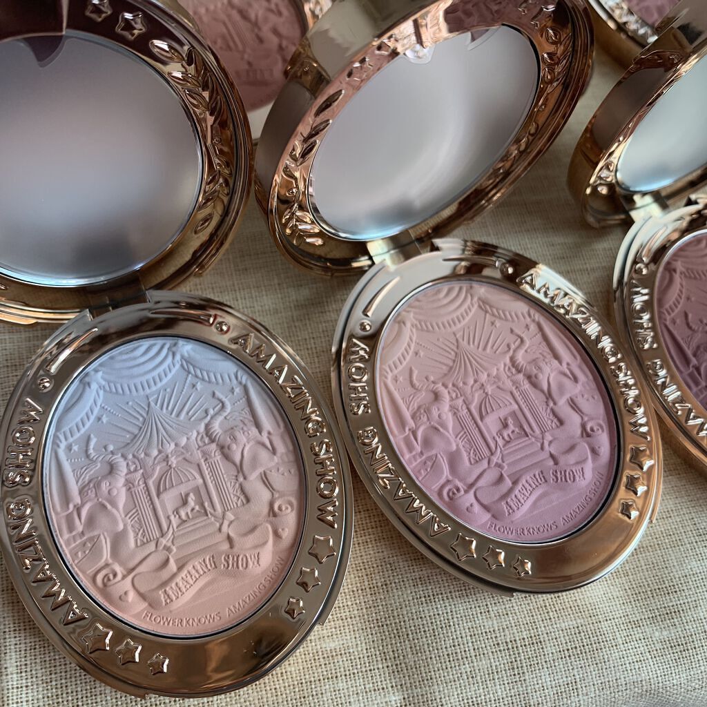 フラワーノーズのアイシャドウとチークを購入しました。だいぶ前に発売されたスワンシリーズのアイシャドウとサーカスシリーズのチークです。 使用感はアイシャドウは結構粉っぽい感じで、ラメは綺麗ですが、少し粉飛びするかなといった感じでした。 淡いピンク色に発色します。色白の人が使うとより顔色が明るく見えると思います。
