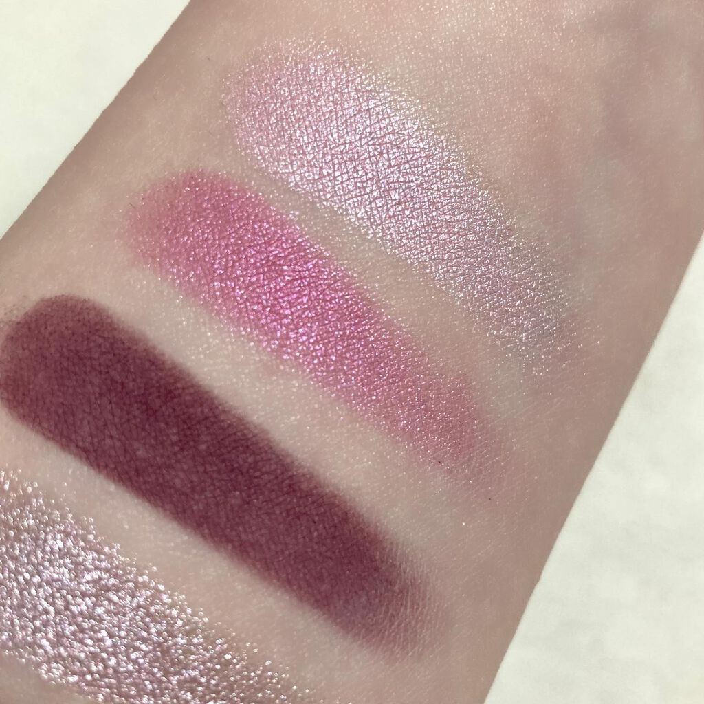 プライマーを使って、密度の高い感じのブラシで 左下ローズを置くように塗る。 ぼかすのは境目だけにして、しっかり色を出す。 右下のダークブラウンと思っていた濃い色は メイクしてみたら結構紫っぽく出たんですが これがまぁくすみ感が強くて…w くすみは何より苦手だよ😂😂 右上のラメはぺかっと光るのがとっても良い!!🤩 割とシンプルなメイクになるな~と思うけど しっかり色出せたので無事使っていけそうです💃🏼💓
