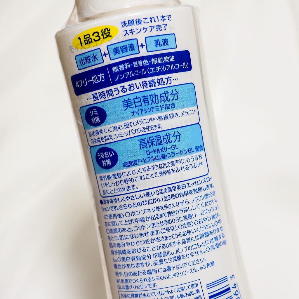- 【医薬部外品】 みずみずしくやさしい使い心地の1品3役薬用美白エッセンスローション。 ・今あるシミ・シミ予備軍にも美白有効成分が直接届く。 肌の奥※1に潜む隠れメラニン※2に直接届くことで、今あるシミだけでなく、 未来のシミのもとにもアプローチ。メラニンの生成を抑え、シミ・ソバカスを防ぎます。 ●美白有効成分:高純度ビタミンC誘導体配合 ・うるおいツヤ成分 ローヤルゼリーエキス新配合。 紫外線や乾燥などにより、くすみがちな肌の奥※1にもうるおいをしっかり貯めこむことで、 透明感あふれるうるツヤ肌にととのえます。 ●高保湿成分:ローヤルゼリー・ヒアルロン酸・コラーゲンGL配合GLは濃グリセリンです。 ・やさしい使い心地にこだわった4フリー処方 ●無香料・無着色・無鉱物油・ノンアルコール(エチルアルコール) ※1 角層 ※2 肌の奥でつくられるシミのもと