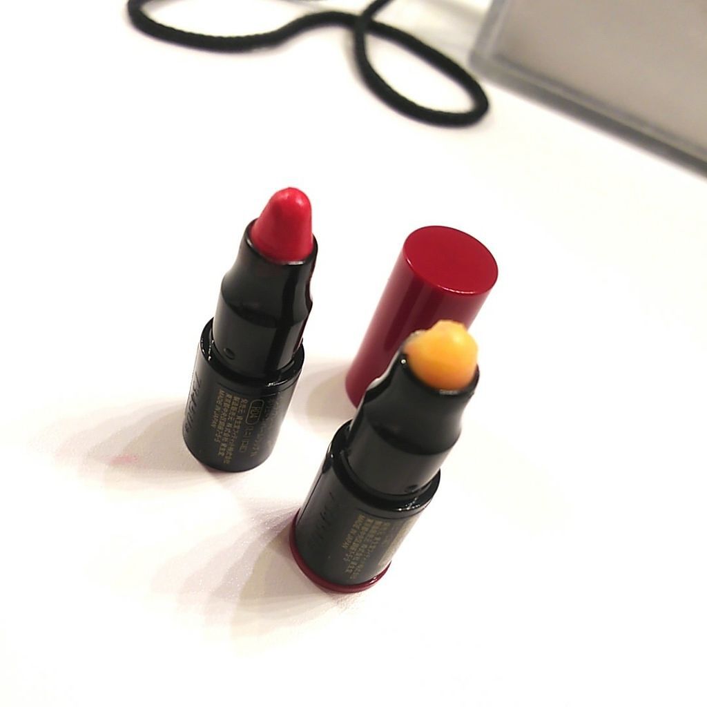 ローソン限定のインテグレートシリーズ500円で2色はいってるボリュームリップバームのミニサイズRD4とあざやかMYPINKどっちも比較的つや感のあるカラーRD4はチェリーレッド、あざやかMYPINKは黄色だけど自分カラーのピンクになるリップテ...