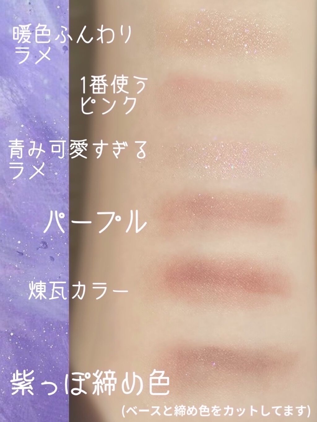 私は毎日メイクで1番涙袋に力をいれているので、 プランぷくコーデアイズにはマットもパールもラメも影も揃っているのでコレ一個で完成できちゃうんです🥺💕 アイベースなしで塗るとかなり淡い発色なので物足りない感じがするのですが、アイベースを塗ってから塗るとピンクが綺麗に発色します💗 マットのカラーも結構ピンクなのでいつもピンクメイクをするよ!という方にお勧めしたいアイシャドウです💐