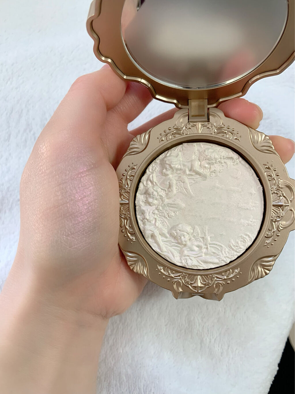 シャンパンピンクをベースにしたハイライター。パッケージデザインはステンドグラスの前で祈る天使を描いた美しいコンパクトで、中のパウダーにも西洋神話をモチーフにした繊細な彫刻が施されている。 まず見た目が可愛すぎる😍ギラギラしすぎなくてすごく使いやすいし、肌なじみのいい色味で変な光り方しないからハイライター初心者(私)にぴったりかも😳 なにより使っててテンション上がるところが高ポイント💡オススメです🙌