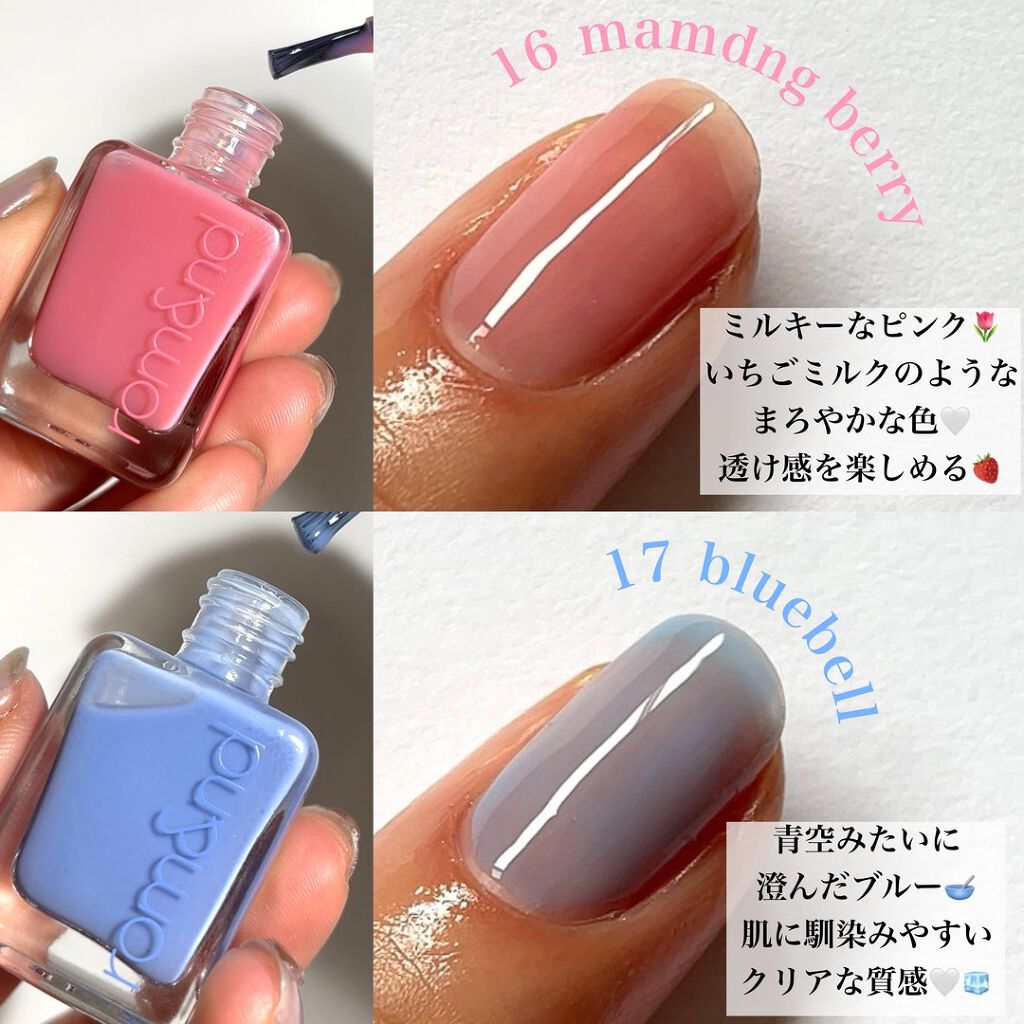 - 指先に玉石のような、ならかな光沢をとどめる。塗った瞬間から綺麗なツヤと光沢を維持し、重ねて塗っても透き通ったカラー感を鮮やかにとどめる、素早い乾燥力のナチュラルカラーネイル。「ロムアンド」の次世代型ネイルです。