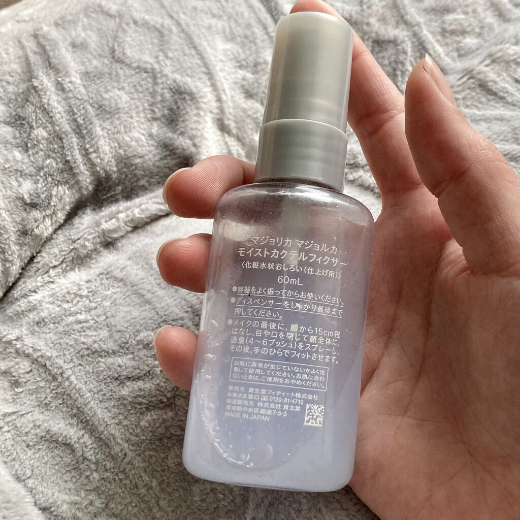 MAJOLICAMAJORCAモイストカクテルフィクサーEX【使った商品】モイストカクテルフィクサーEX【商品の特徴】¥1,320円(税込)60ml化粧水状おしろい(仕上げ用)【使用感】2層式で振るタイプのミストビシャってかかるが割と細かく馴...