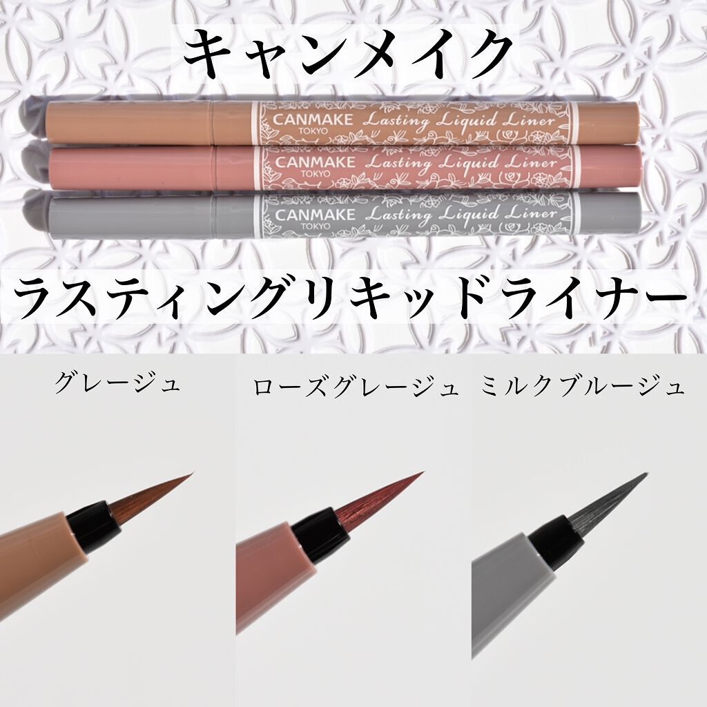 キャンメイクのリキッドアイライナーです✨️ 05グレージュは薄めのブラウンって感じがしました!ブラウンよりも優しい印象になる気がします🧸 10セピアグレージュは実際描いてみるとあまりグレー感は感じないですがブラックより優しい色味でキツすぎない印象になります☺️