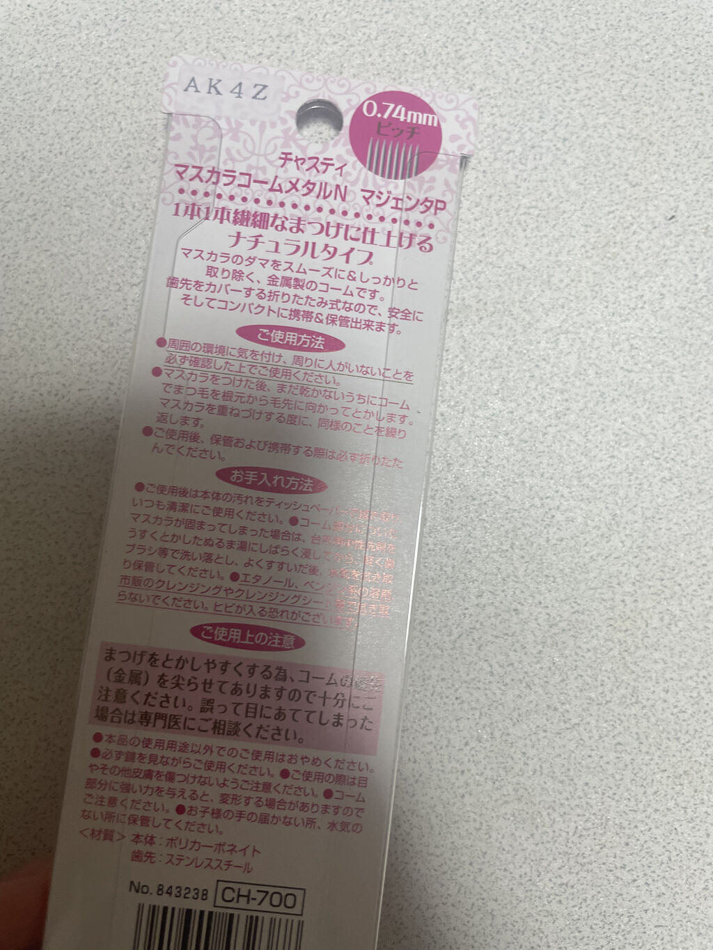 チャスティマスカラコームメタルNマゼンダP壊れてしまいました・・・コンパクトで使いやすく気に入っていたので残念です😭このタイプはコームの部分が細かくまつ毛のセパレートが綺麗に作れますその分、まつ毛を通すのは大変ですが、、メタルタイプなのでコー...