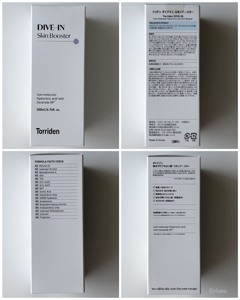 - <ダイブイン スキンブースター> 水、グリセリン、BG、トリ(カプリル酸/カプリン酸)グリセリル、(C14-22)アルコール、1,2-ヘキサンジオール、グリセレス-26、(アクリレーツ/アクリル酸アルキル(C10-30))クロスポリマー、(C12-20)アルキルグルコシド、(アクリル酸グリセリル/アクリル酸)コポリマー、パンテノール、アラントイン、(メチルビニルエーテル/マレイン酸)/コポリマー、孔雀石抽出物、ペンチレングリコール、ヒアルロン酸Na、エチルヘキシルグリセリン、トロメタミン、加水分解ヒアルロン酸、ヒアルロン酸クロスポリマーNa、加水分解ヒアルロン酸Na、アセチルヒアルロン酸Na、EDTA-2Na、トレハロース、キサンタンガム、セラミドNP、フィトスフィンゴシン、オウゴン根エキス、ボタンエキス、ローマカミツレ花エキス、ハマメリス葉エキス