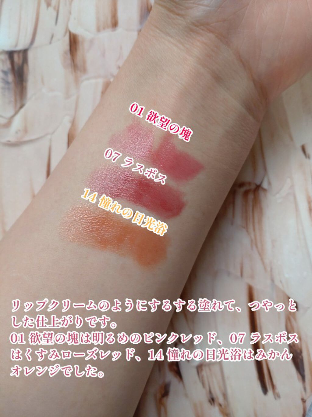 - <01 欲望の塊> テトライソステアリン酸ジペンタエリスリチル、トリ(カプリル酸/カプリン酸)グリセリル、オクチルドデカノール、ラウロイルグルタミン酸ジ(フィトステリル/オクチルドデシル)、ビスアルキル(C16-18)グリセリルウンデシルジメチコン、イソノナン酸イソトリデシル、水添ポリイソブテン、ラウロイルグルタミン酸ジ(オクチルドデシル/フィトステリル/ベヘニル)、パラフィン、合成ワックス、ダイマージリノール酸(フィトステリル/イソステアリル/セチル/ステアリル/ベヘニル)、マイクロクリスタリンワックス、水添マイクロクリスタリンワックス、ヒドロキシステアリン酸エチルヘキシル、トコフェロール、ホホバ種子油、オリーブ果実油、アーモンド油、(エチレン/プロピレン)コポリマー、ポリエチレン、ジメチコン、(+/-)(チタン/酸化チタン)焼結物、マイカ、ラウロイルアスパラギン酸Na、ラウロイルリシン、塩化亜鉛、酸化チタン、酸化鉄、水酸化Al、硫酸Ba、トリイソステアリン酸イソプロピルチタン、酸化スズ、ホウケイ酸(Ca/Al)、合成フルオロフロゴパイト、黄4、黄5、赤104(1)、赤201、赤202 <02 ピンクバナナ> テトライソステアリン酸ジペンタエリスリチル、トリ(カプリル酸/カプリン酸)グリセリル、オクチルドデカノール、ラウロイルグルタミン酸ジ(フィトステリル/オクチルドデシル)、ビスアルキル(C16-18)グリセリルウンデシルジメチコン、イソノナン酸イソトリデシル、水添ポリイソブテン、ラウロイルグルタミン酸ジ(オクチルドデシル/フィトステリル/ベヘニル)、パラフィン、合成ワックス、ダイマージリノール酸(フィトステリル/イソステアリル/セチル/ステアリル/ベヘニル)、マイクロクリスタリンワックス、水添マイクロクリスタリンワックス、ヒドロキシステアリン酸エチルヘキシル、トコフェロール、ホホバ種子油、オリーブ果実油、アーモンド油、(エチレン/プロピレン)コポリマー、ポリエチレン、ジメチコン、(+/-)(チタン/酸化チタン)焼結物、マイカ、ラウロイルアスパラギン酸Na、ラウロイルリシン、塩化亜鉛、酸化チタン、酸化鉄、水酸化Al、硫酸Ba、トリイソステアリン酸イソプロピルチタン、酸化スズ、ホウケイ酸(Ca/Al)、合成フルオロフロゴパイト、黄4、黄5、赤104(1)、赤201、赤202 <03 陽炎> テトライソステアリン酸ジペンタエリスリチル、トリ(カプリル酸/カプリン酸)グリセリル、オクチルドデカノール、ラウロイルグルタミン酸ジ(フィトステリル/オクチルドデシル)、ビスアルキル(C16-18)グリセリルウンデシルジメチコン、イソノナン酸イソトリデシル、水添ポリイソブテン、ラウロイルグルタミン酸ジ(オクチルドデシル/フィトステリル/ベヘニル)、パラフィン、合成ワックス、ダイマージリノール酸(フィトステリル/イソステアリル/セチル/ステアリル/ベヘニル)、マイクロクリスタリンワックス、水添マイクロクリスタリンワックス、ヒドロキシステアリン酸エチルヘキシル、トコフェロール、ホホバ種子油、オリーブ果実油、アーモンド油、(エチレン/プロピレン)コポリマー、ポリエチレン、ジメチコン、(+/-)(チタン/酸化チタン)焼結物、マイカ、ラウロイルアスパラギン酸Na、ラウロイルリシン、塩化亜鉛、酸化チタン、酸化鉄、水酸化Al、硫酸Ba、トリイソステアリン酸イソプロピルチタン、酸化スズ、ホウケイ酸(Ca/Al)、合成フルオロフロゴパイト、黄4、黄5、赤104(1)、赤201、赤202 <04 パンプキンワイン> テトライソステアリン酸ジペンタエリスリチル、トリ(カプリル酸/カプリン酸)グリセリル、オクチルドデカノール、ラウロイルグルタミン酸ジ(フィトステリル/オクチルドデシル)、ビスアルキル(C16-18)グリセリルウンデシルジメチコン、イソノナン酸イソトリデシル、水添ポリイソブテン、ラウロイルグルタミン酸ジ(オクチルドデシル/フィトステリル/ベヘニル)、パラフィン、合成ワックス、ダイマージリノール酸(フィトステリル/イソステアリル/セチル/ステアリル/ベヘニル)、マイクロクリスタリンワックス、水添マイクロクリスタリンワックス、ヒドロキシステアリン酸エチルヘキシル、トコフェロール、ホホバ種子油、オリーブ果実油、アーモンド油、(エチレン/プロピレン)コポリマー、ポリエチレン、ジメチコン、(+/-)(チタン/酸化チタン)焼結物、マイカ、ラウロイルアスパラギン酸Na、ラウロイルリシン、塩化亜鉛、酸化チタン、酸化鉄、水酸化Al、硫酸Ba、トリイソステアリン酸イソプロピルチタン、酸化スズ、ホウケイ酸(Ca/Al)、合成フルオロフロゴパイト、黄4、黄5、赤104(1)、赤201、赤202 <05 ダークフィグ> テトライソステアリン酸ジペンタエリスリチル、トリ(カプリル酸/カプリン酸)グリセリル、オクチルドデカノール、ラウロイルグルタミン酸ジ(フィトステリル/オクチルドデシル)、ビスアルキル(C16-18)グリセリルウンデシルジメチコン、イソノナン酸イソトリデシル、水添ポリイソブテン、ラウロイルグルタミン酸ジ(オクチルドデシル/フィトステリル/ベヘニル)、
