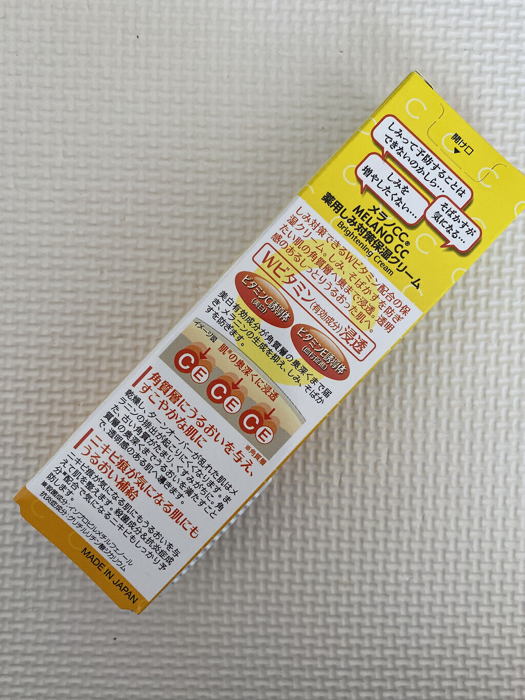 - 「メラノCC 薬用しみ対策 保湿クリーム」は、美白有効成分「ビタミンC誘導体*1」と整肌成分「ビタミンE誘導体*2」の働きで、メラニンの生成を抑え、しみ・そばかすを防ぐ保湿クリーム。 肌の角質層すみずみまで浸透。メラニンの生成を抑え、しみ、そばかすを防ぎ、透明感のあるしっとりうるおった肌へ。ニキビ痕が気になる肌にも、うるおいを与えて肌を整えます。イソプロピルメチルフェノール(殺菌成分)とグリチルリチン酸ジカリウム(抗炎症成分)配合で、気になるニキビもしっかり予防。伸びがよくべたつかない、みずみずしい使用感です。 化粧水や乳液等で肌を整えた後、パール粒1個分くらいを手のひらに取り、気になる部分を中心に、顔全体になじませてください。朝晩の使用で約2ヶ月分です。 *1:L-アスコルビン酸2-グルコシド *2:トコフェロール酢酸エステル