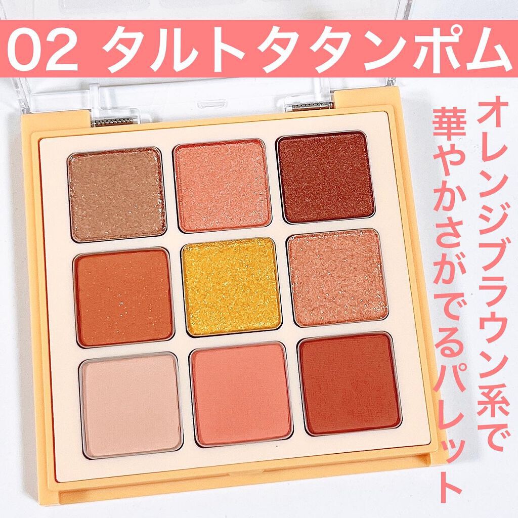 - 01 <a/f> ジメチコン、トリ(カプリル酸/カプリン酸)グリセリル、(ジメチコン/ビニルジメチコン) クロスポリマー、タルク、カルナウバロウ、クロルフェネシン、デヒドロ酢酸Na、ラウロイルリシン、トコフェロール、ホウケイ酸(Ca/Al)、マイカ、(PET/ポリメタクリル酸メチル)ラミネート、酸化チタン、酸化鉄、赤226、グンジョウ、酸化スズ <b/e> トリ(カプリル酸/カプリン酸)グリセリル、シリカ、ダイマージリノール酸ジ(イソステアリル/フィトステリル)、合成フルオロフロゴパイト、ダイマージリノール酸ダイマージリノレイルビス(ベヘニル/イソステアリル/フィトステリル)、水酸化Al、カルナウバロウ、トコフェロール、ホウケイ酸(Ca/Al)、マイカ、酸化チタン、酸化鉄、グンジョウ、赤226、コンジョウ、酸化スズ <c> アルミナ、合成フルオロフロゴパイト、タルク、ジフェニルシロキシフェニルトリメチコン、水添ポリデセン、(イソステアリン酸ポリグリセリル-2/ダイマージリノール酸)コポリマー、ジメチコン、硫酸Ba、ジステアリン酸Al、クロルフェネシン、デヒドロ酢酸Na、ステアリン酸Mg、トコフェロール、酸化チタン、マイカ、酸化鉄、グンジョウ、酸化スズ <d/g/h/i> タルク、合成フルオロフロゴパイト、窒化ホウ素、スクワラン、ナイロン-12、(ビニルジメチコン/メチコンシルセスキオキサン)クロスポリマー、ペンチレングリコール、ホホバ種子油、デヒドロ酢酸Na、水酸化Al、シア脂、トコフェロール、マイカ、酸化鉄、酸化チタン、赤226、グンジョウ、ホウケイ酸(Ca/Al)、酸化スズ 02 <a> ジメチコン、トリ(カプリル酸/カプリン酸)グリセリル、(ジメチコン/ビニルジメチコン)クロスポリマー、タルク、カルナウバロウ、クロルフェネシン、デヒドロ酢酸Na、ラウロイルリシン、トコフェロール、マイカ、ホウケイ酸(Ca/Al)、酸化チタン、酸化鉄、酸化スズ <b> アルミナ、タルク、合成フルオロフロゴパイト、ジフェニルシロキシフェニルトリメチコン、水添ポリデセン、(イソステアリン酸ポリグリセリル-2/ダイマージリノール酸)コポリマー、ジメチコン、硫酸Ba、ジステアリン酸Al、ステアリン酸Mg、クロルフェネシン、デヒドロ酢酸Na、トコフェロール、酸化チタン、マイカ、酸化鉄、赤226、グンジョウ、酸化スズ <c/e/f> トリ(カプリル酸/カプリン酸)グリセリル、シリカ、ダイマージリノール酸ジ(イソステアリル/フィトステリル)、ダイマージリノール酸ダイマージリノレイルビス(ベヘニル/イソステアリル/フィトステリル)、水酸化Al、合成フルオロフロゴパイト、カルナウバロウ、トコフェロール、マイカ、ホウケイ酸(Ca/Al)、酸化チタン、酸化鉄、黄4、赤226、グンジョウ、酸化スズ <d/g/h/i> タルク、合成フルオロフロゴパイト、窒化ホウ素、スクワラン、ナイロン-12、(ビニルジメチコン/メチコンシルセスキオキサン)クロスポリマー、ペンチレングリコール、ホホバ種子油、デヒドロ酢酸Na、水酸化Al、シア脂、トコフェロール、マイカ、酸化鉄、酸化チタン、ホウケイ酸(Ca/Al)、赤226、黄4、グンジョウ、酸化スズ ※アルファベットはパレットを正面から見た1段目左からabc、2段目左からdef、3段目左からghiの順です。